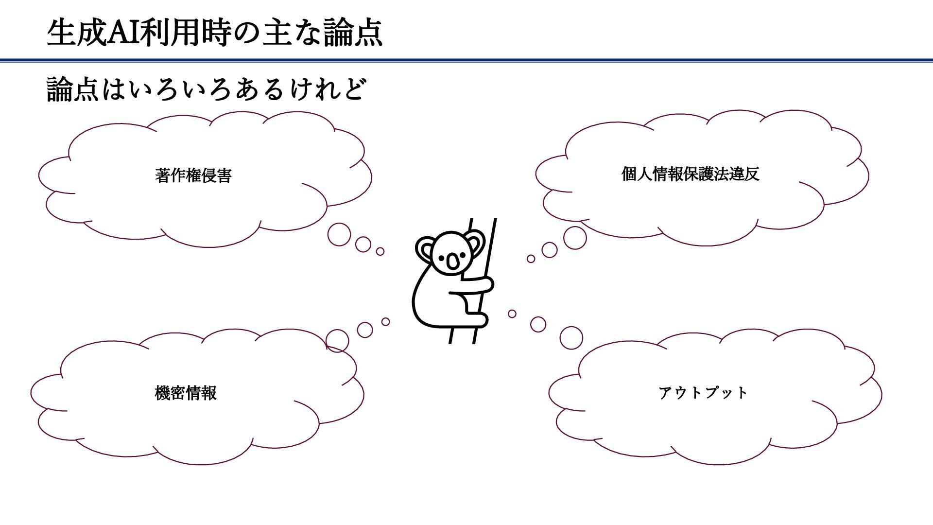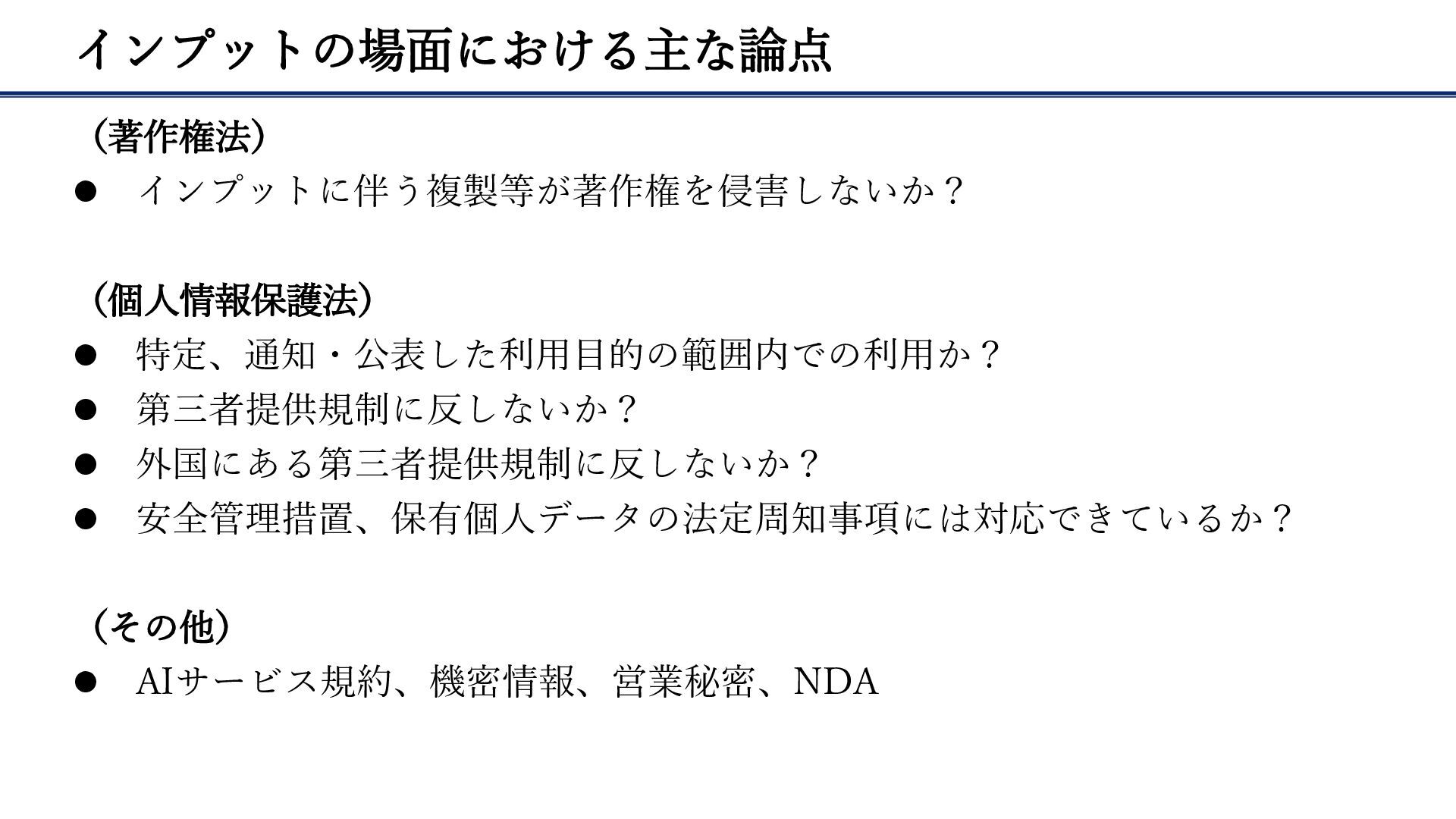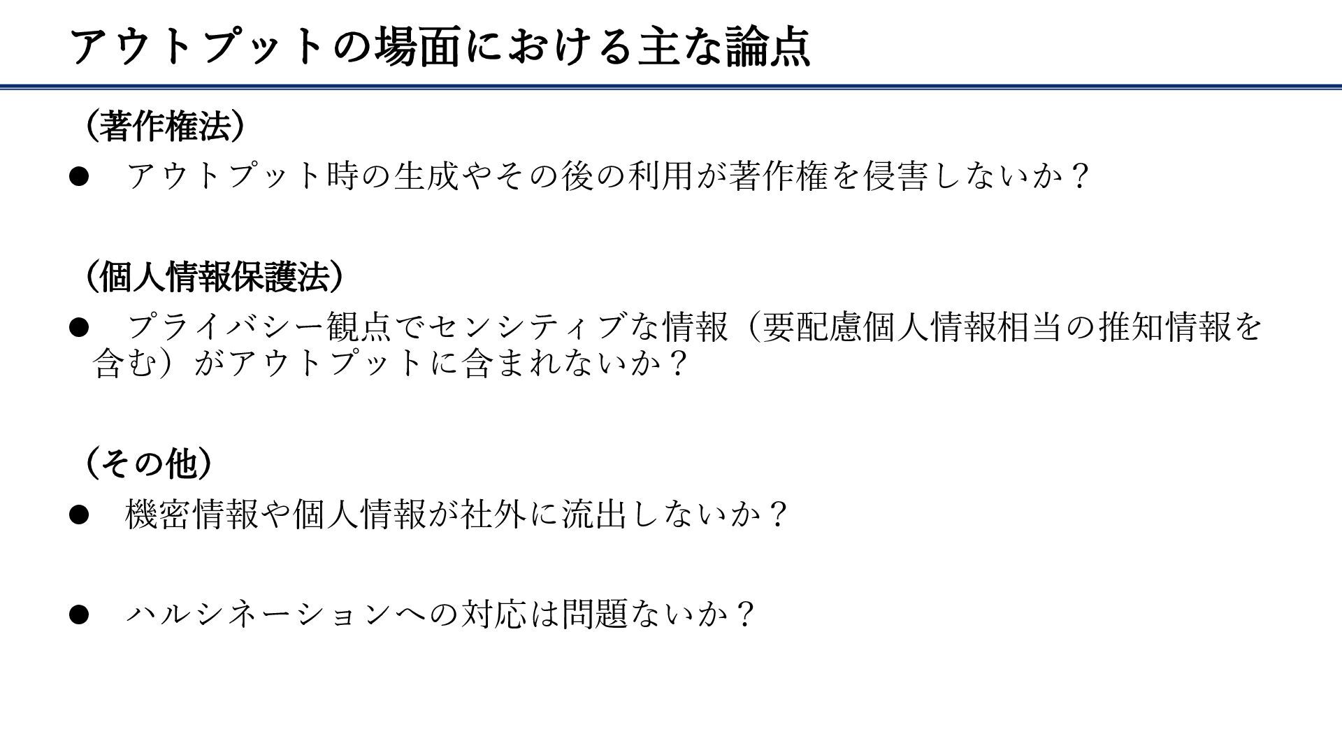 生成AI利用時の主な論点 論点はいろいろあるけれど 著作権侵害 アウトプット 個人情報保護法違反 機密情報