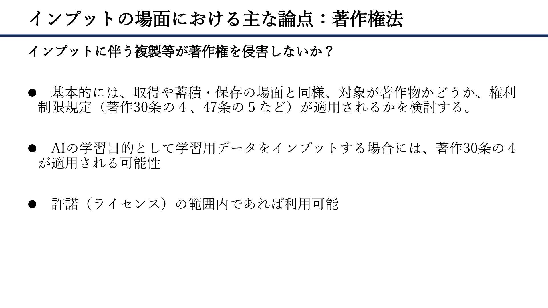 インプットの場面における主な論点:著作権法 インプットに伴う複製等が著作権を侵害しないか? ⚫ 基本的には、取得や蓄積・保存の場面と同様、対象が著作物かどうか、権利 制限規定(著作30条の4、47条の5など)が適用されるかを検討する。 ⚫ AIの学習目的として学習用データをインプットする場合には、著作30条の4 が適用される可能性 ⚫ 許諾(ライセンス)の範囲内であれば利用可能