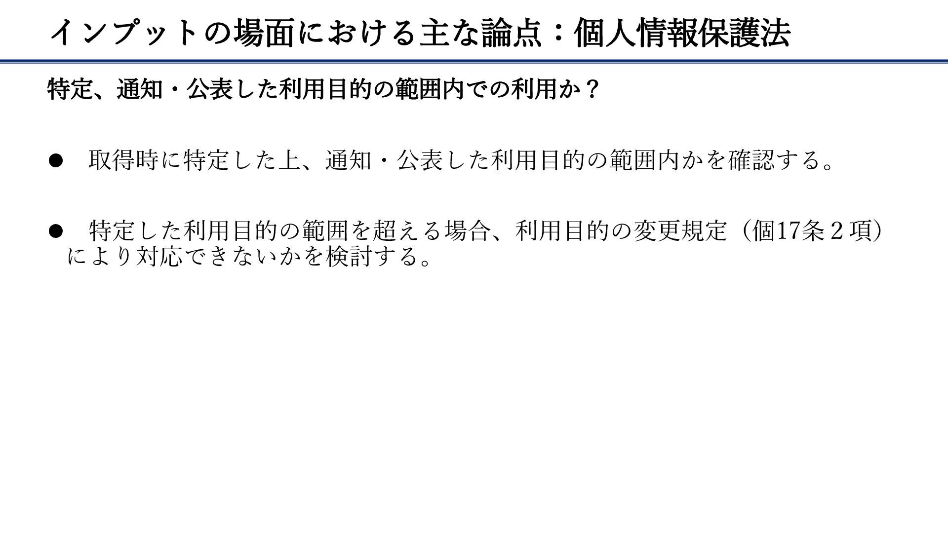 インプットの場面における主な論点:個人情報保護法 特定、通知・公表した利用目的の範囲内での利用か? ⚫ 取得時に特定した上、通知・公表した利用目的の範囲内かを確認する。 ⚫ 特定した利用目的の範囲を超える場合、利用目的の変更規定(個17条2項) により対応できないかを検討する。