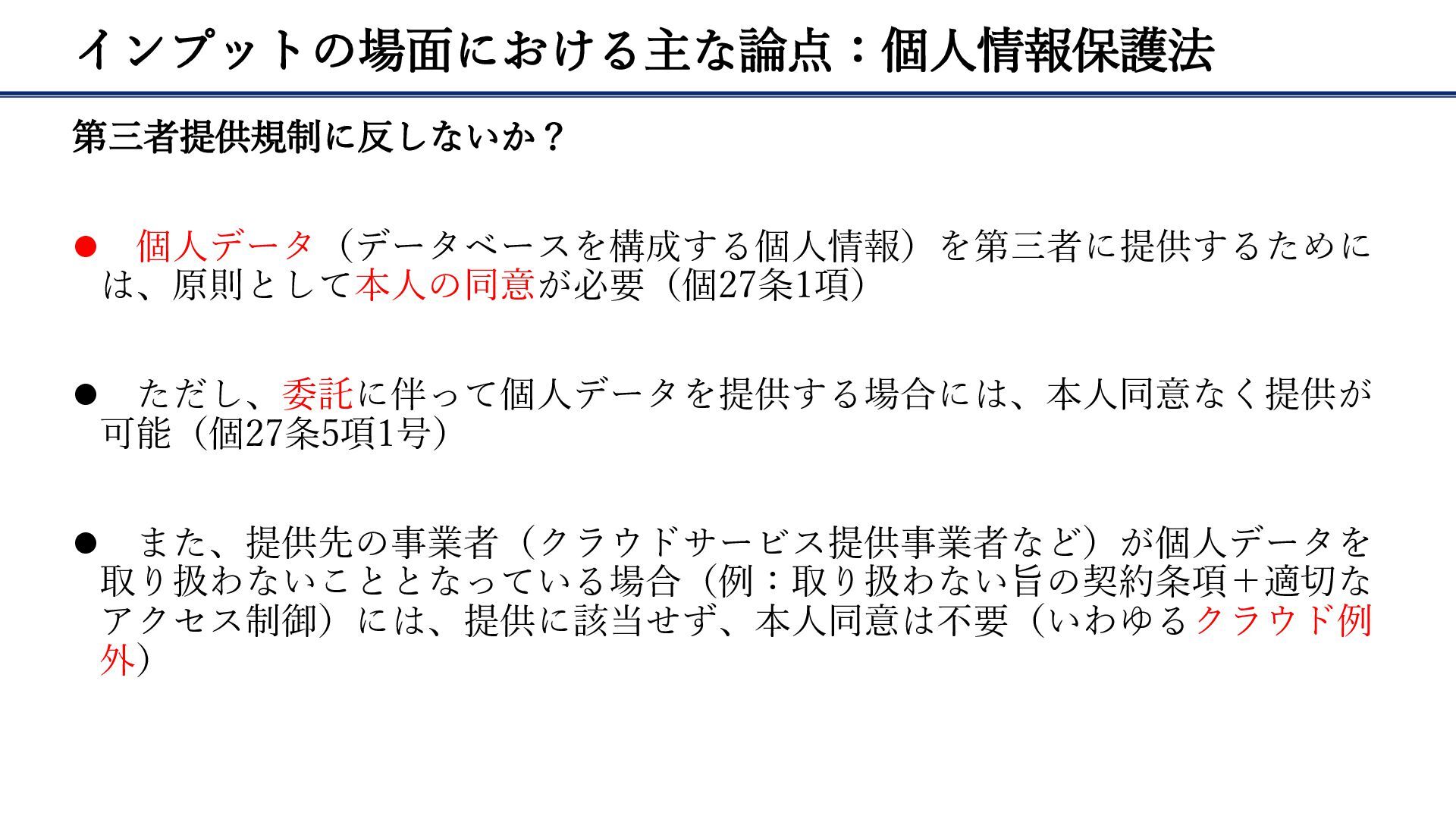 インプットの場面における主な論点:個人情報保護法 第三者提供規制に反しないか? ⚫ 個人データ(データベースを構成する個人情報)を第三者に提供するために は、原則として本人の同意が必要(個27条1項) ⚫ ただし、委託に伴って個人データを提供する場合には、本人同意なく提供が 可能(個27条5項1号) ⚫ また、提供先の事業者(クラウドサービス提供事業者など)が個人データを