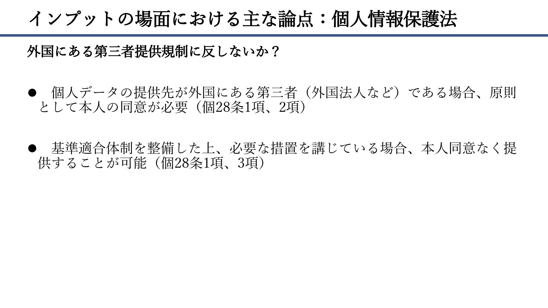 インプットの場面における主な論点:個人情報保護法 外国にある第三者提供規制に反しないか? ⚫ 個人データの提供先が外国にある第三者(外国法人など)である場合、原則 として本人の同意が必要(個28条1項、2項) ⚫ 基準適合体制を整備した上、必要な措置を講じている場合、本人同意なく提 供することが可能(個28条1項、3項)