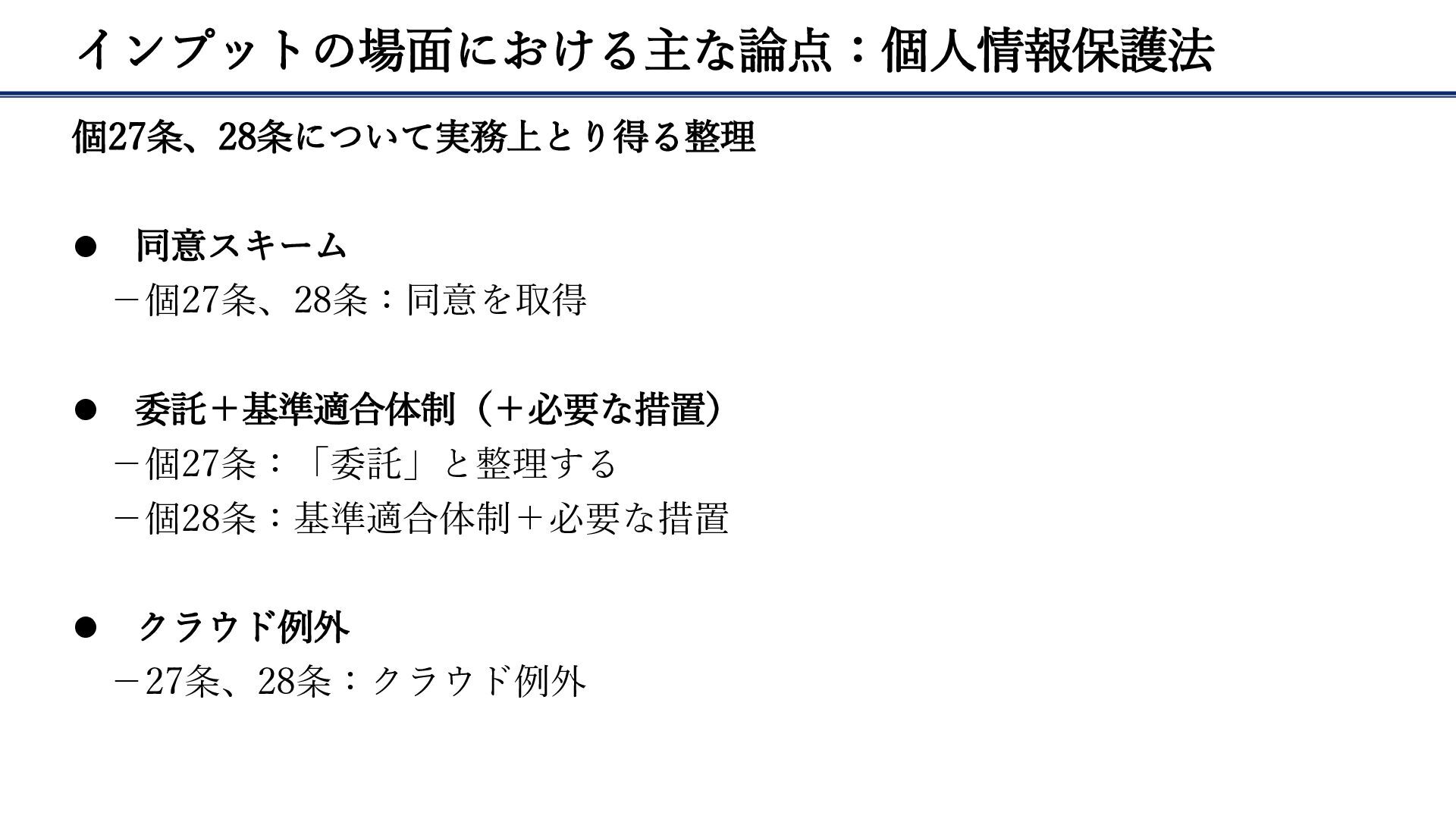 インプットの場面における主な論点:個人情報保護法 個27条、28条について実務上とり得る整理 ⚫ 同意スキーム -個27条、28条:同意を取得 ⚫ 委託+基準適合体制(+必要な措置) -個27条:「委託」と整理する -個28条:基準適合体制+必要な措置 ⚫