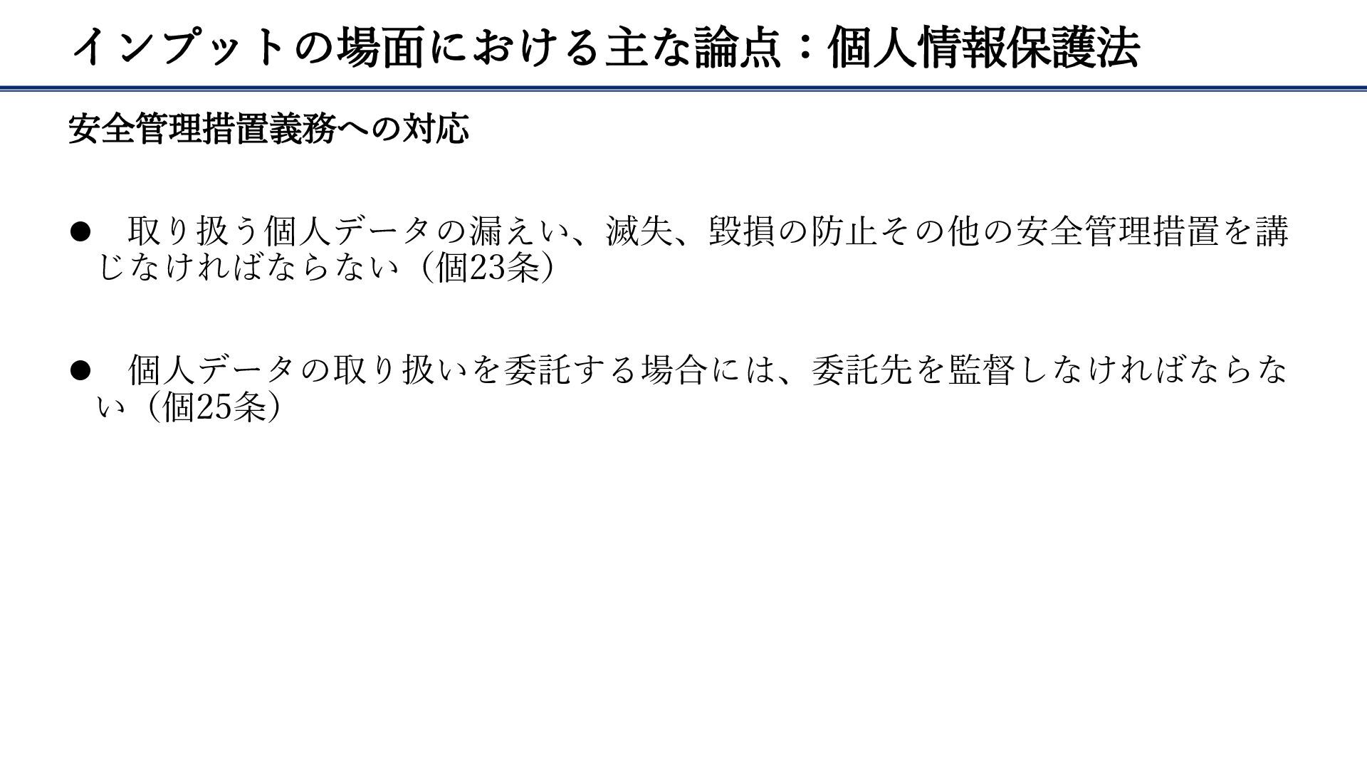 インプットの場面における主な論点:個人情報保護法 安全管理措置義務への対応 ⚫ 取り扱う個人データの漏えい、滅失、毀損の防止その他の安全管理措置を講 じなければならない(個23条) ⚫ 個人データの取り扱いを委託する場合には、委託先を監督しなければならな い(個25条)