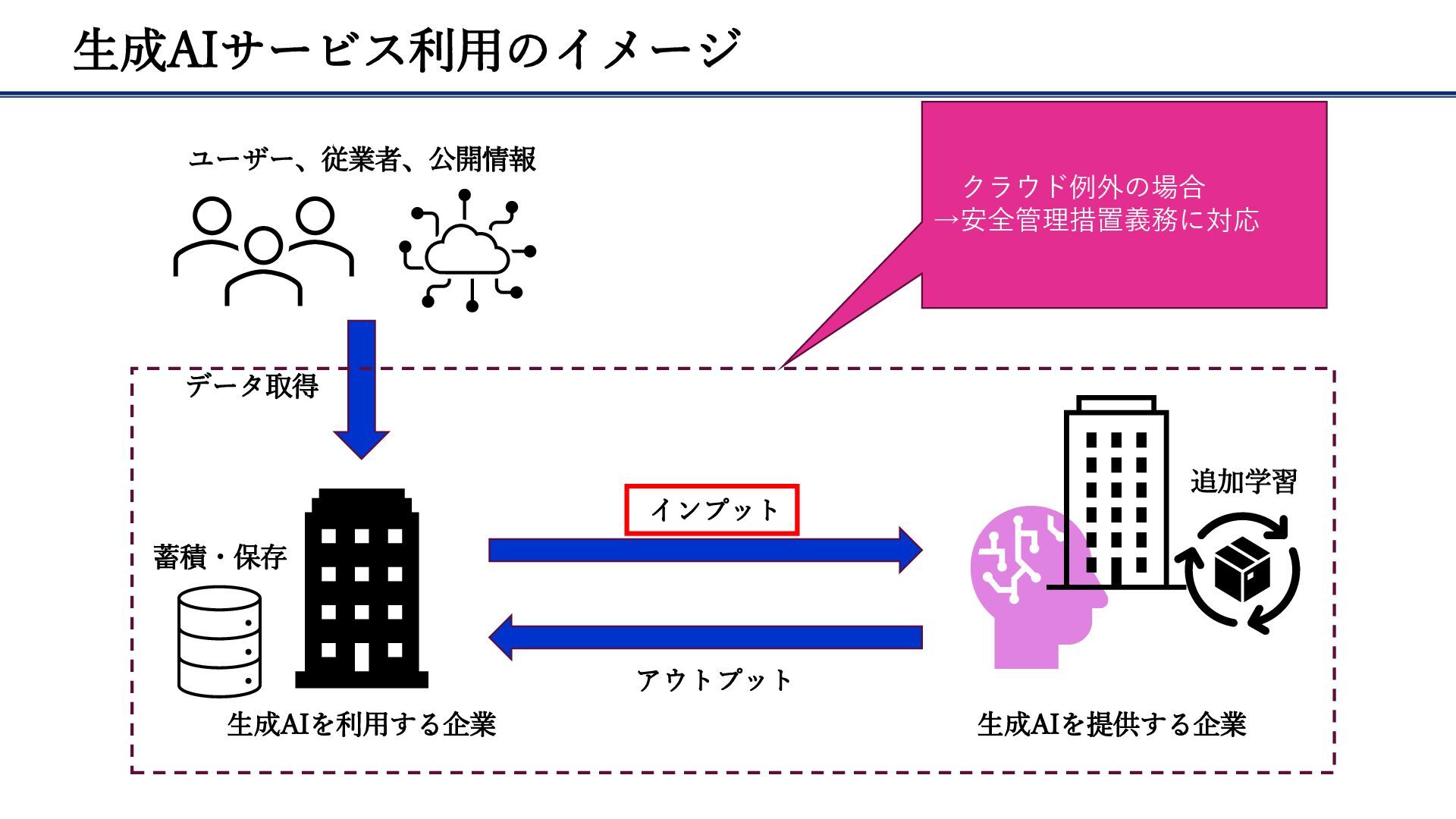 生成AIサービス利用のイメージ ユーザー、従業者、公開情報 データ取得 生成AIを利用する企業 生成AIを提供する企業 インプット アウトプット 蓄積・保存 追加学習 クラウド例外の場合