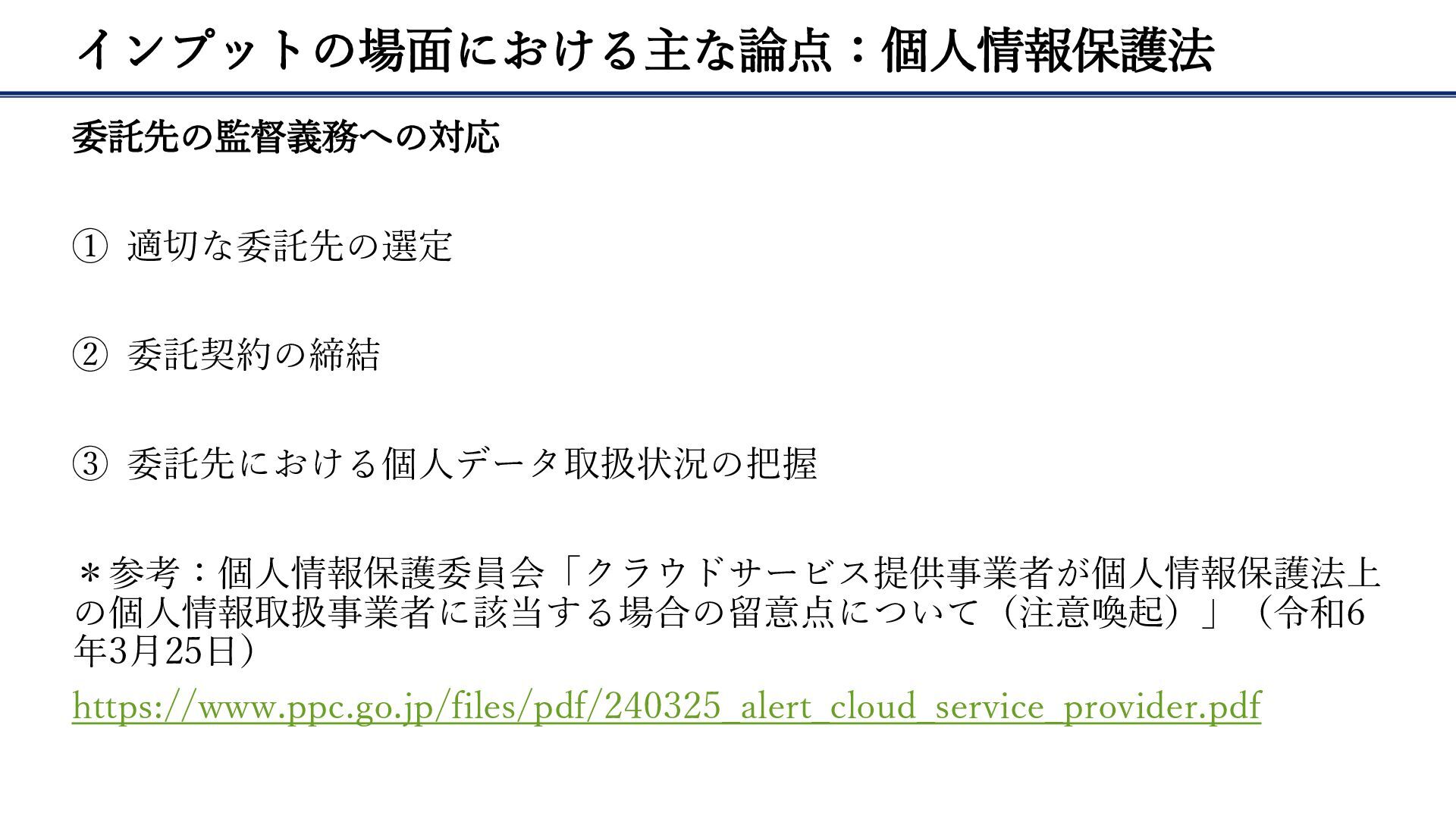インプットの場面における主な論点:個人情報保護法 委託先の監督義務への対応 ① 適切な委託先の選定 ② 委託契約の締結 ③ 委託先における個人データ取扱状況の把握 *参考:個人情報保護委員会「クラウドサービス提供事業者が個人情報保護法上 の個人情報取扱事業者に該当する場合の留意点について(注意喚起)」(令和6