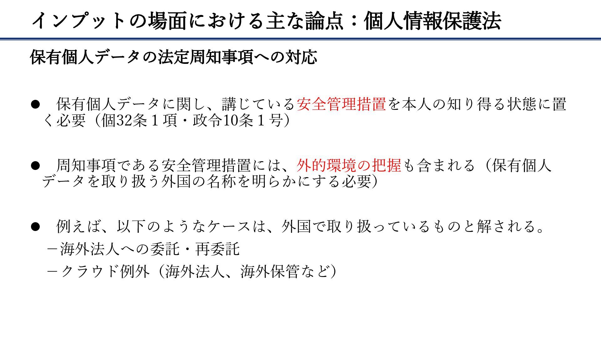 インプットの場面における主な論点:個人情報保護法 保有個人データの法定周知事項への対応 ⚫ 保有個人データに関し、講じている安全管理措置を本人の知り得る状態に置 く必要(個32条1項・政令10条1号) ⚫ 周知事項である安全管理措置には、外的環境の把握も含まれる(保有個人 データを取り扱う外国の名称を明らかにする必要) ⚫ 例えば、以下のようなケースは、外国で取り扱っているものと解される。