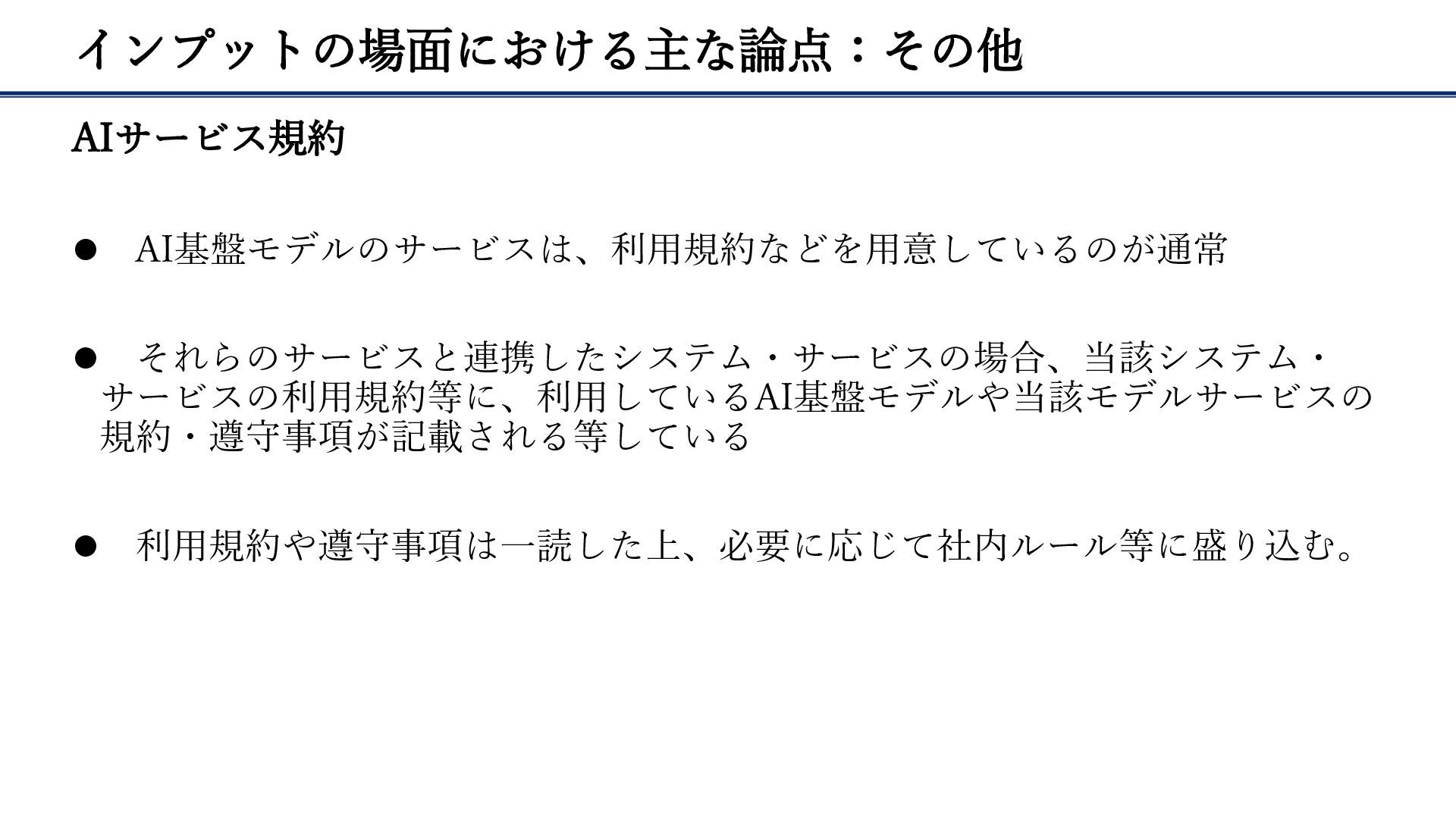 インプットの場面における主な論点:その他 AIサービス規約 ⚫ AI基盤モデルのサービスは、利用規約などを用意しているのが通常 ⚫ それらのサービスと連携したシステム・サービスの場合、当該システム・ サービスの利用規約等に、利用しているAI基盤モデルや当該モデルサービスの 規約・遵守事項が記載される等している ⚫ 利用規約や遵守事項は一読した上、必要に応じて社内ルール等に盛り込む。