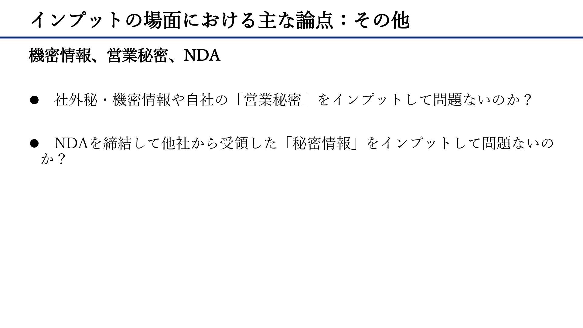 インプットの場面における主な論点:その他 機密情報、営業秘密、NDA ⚫ 社外秘・機密情報や自社の「営業秘密」をインプットして問題ないのか? ⚫ NDAを締結して他社から受領した「秘密情報」をインプットして問題ないの か?