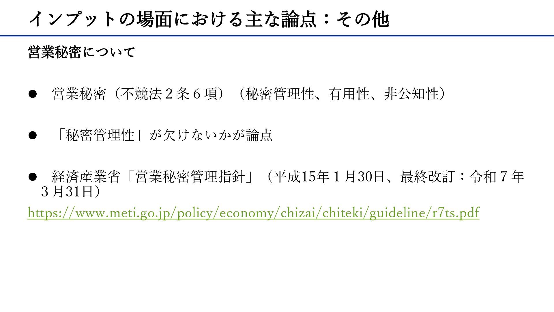 インプットの場面における主な論点:その他 営業秘密について ⚫ 営業秘密(不競法2条6項)(秘密管理性、有用性、非公知性) ⚫ 「秘密管理性」が欠けないかが論点 ⚫ 経済産業省「営業秘密管理指針」(平成15年1月30日、最終改訂:令和7年 3月31日) https://www.meti.go.jp/policy/economy/chizai/chiteki/guideline/r7ts.pdf