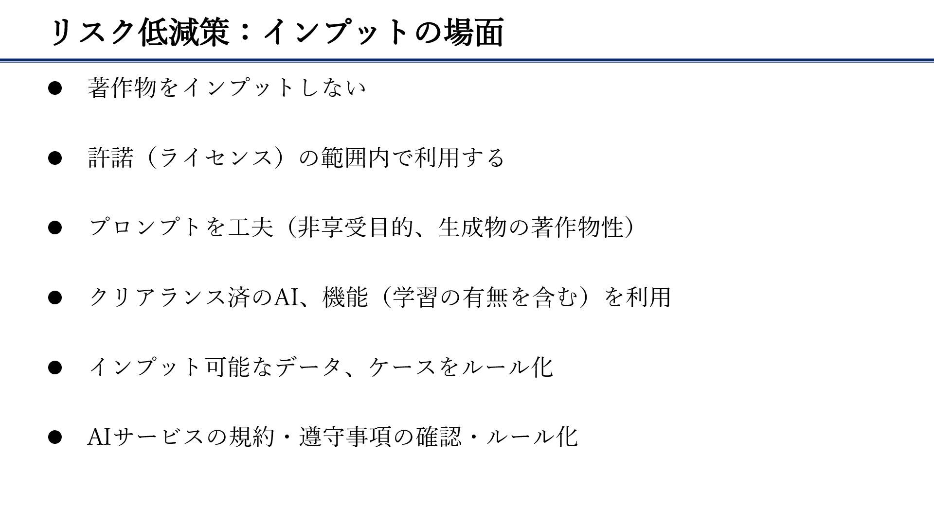 リスク低減策:インプットの場面 ⚫ 著作物をインプットしない ⚫ 許諾(ライセンス)の範囲内で利用する ⚫ プロンプトを工夫(非享受目的、生成物の著作物性) ⚫ クリアランス済のAI、機能(学習の有無を含む)を利用 ⚫