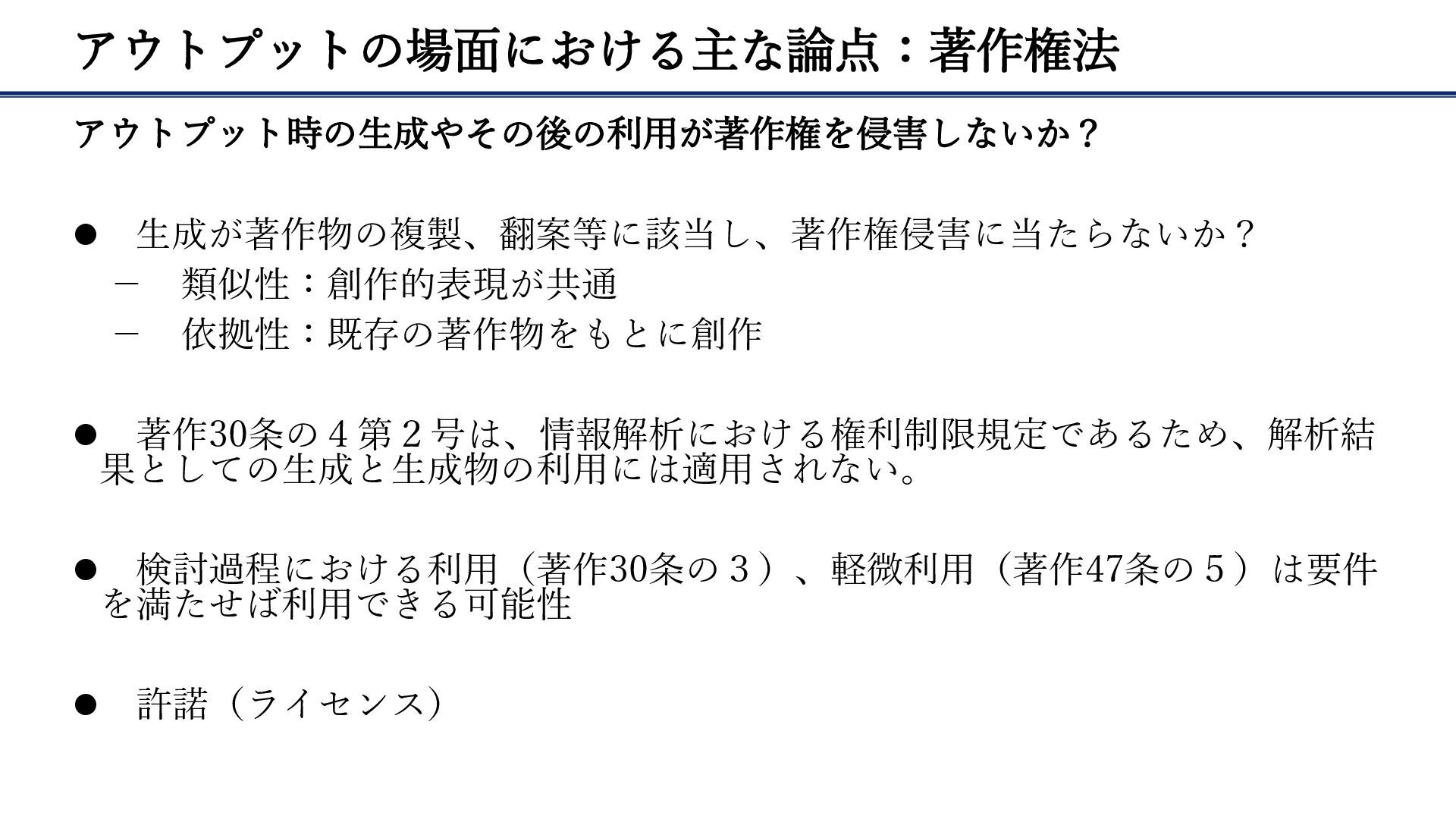アウトプットの場面における主な論点:著作権法 アウトプット時の生成やその後の利用が著作権を侵害しないか? ⚫ 生成が著作物の複製、翻案等に該当し、著作権侵害に当たらないか? - 類似性:創作的表現が共通 - 依拠性:既存の著作物をもとに創作 ⚫ 著作30条の4第2号は、情報解析における権利制限規定であるため、解析結