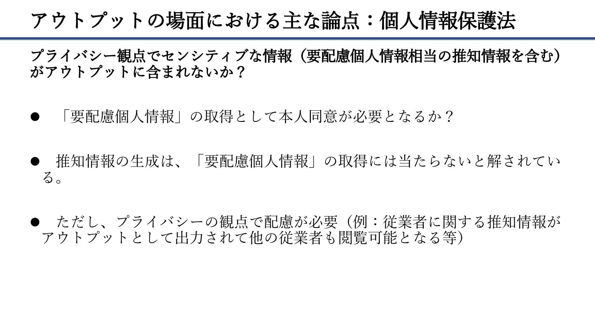アウトプットの場面における主な論点:個人情報保護法 プライバシー観点でセンシティブな情報(要配慮個人情報相当の推知情報を含む) がアウトプットに含まれないか? ⚫ 「要配慮個人情報」の取得として本人同意が必要となるか? ⚫ 推知情報の生成は、「要配慮個人情報」の取得には当たらないと解されてい る。 ⚫ ただし、プライバシーの観点で配慮が必要(例:従業者に関する推知情報が