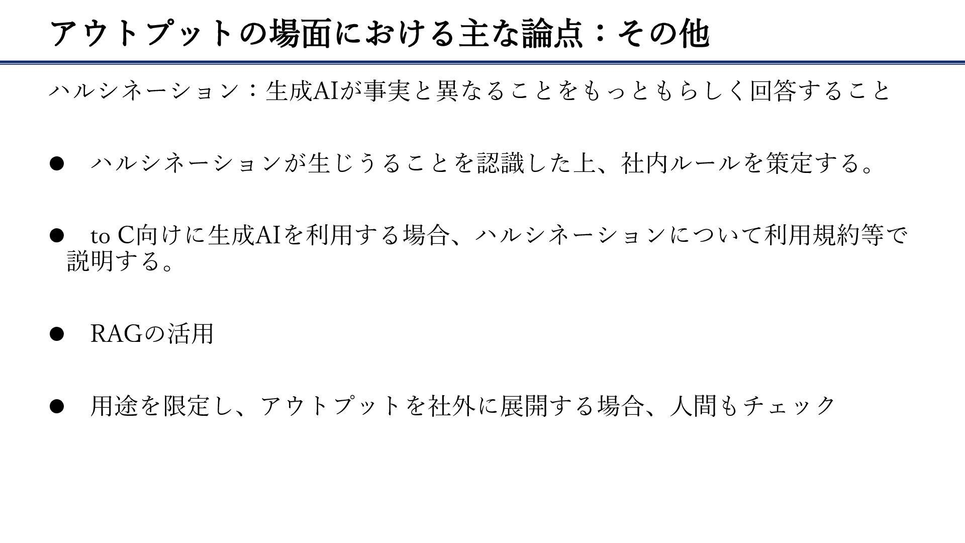 アウトプットの場面における主な論点:その他 ハルシネーション:生成AIが事実と異なることをもっともらしく回答すること ⚫ ハルシネーションが生じうることを認識した上、社内ルールを策定する。 ⚫ to C向けに生成AIを利用する場合、ハルシネーションについて利用規約等で 説明する。 ⚫ RAGの活用