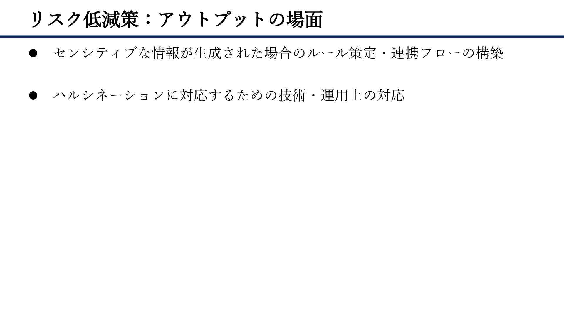 リスク低減策:アウトプットの場面 ⚫ センシティブな情報が生成された場合のルール策定・連携フローの構築 ⚫ ハルシネーションに対応するための技術・運用上の対応