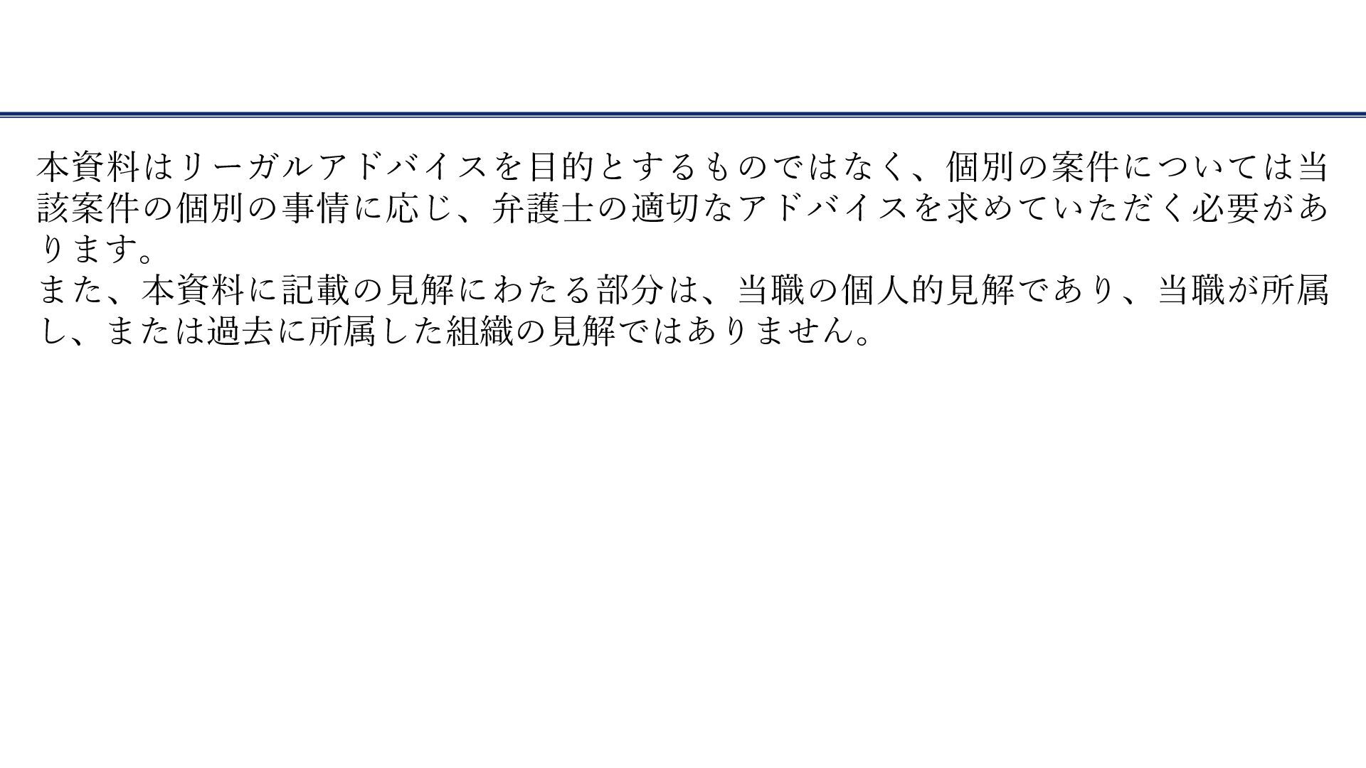 本資料はリーガルアドバイスを目的とするものではなく、個別の案件については当 該案件の個別の事情に応じ、弁護士の適切なアドバイスを求めていただく必要があ ります。 また、本資料に記載の見解にわたる部分は、当職の個人的見解であり、当職が所属 し、または過去に所属した組織の見解ではありません。