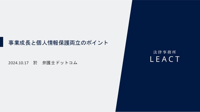 10/17(木)の12:00-13:00において、弁護士ドットコム株式会社様で実施した、 「事業成長と個人情報保護両立のポイント」の登壇資料です。 https://cs.cloudsign.jp/seminar_in-house-lawyer