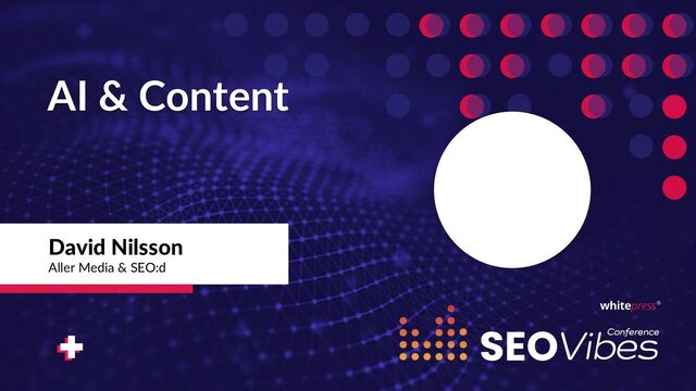 22/9 2023 I talked about "SEO: AI & Content" on SEO Vibes Stockholm for +100 people. This is the presentation from that talk. Thanks to WhitePress for inviting me.