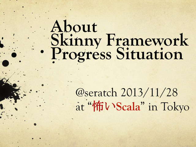 similar to Padrino?) ! Apps and framework should be skinny ! su-ki-ni = “As you like it” in Japanese ! Servlet is useful enough ! Easy-to-use but production-ready ! Scalatra + ScalikeJDBC + Scalate + json4s