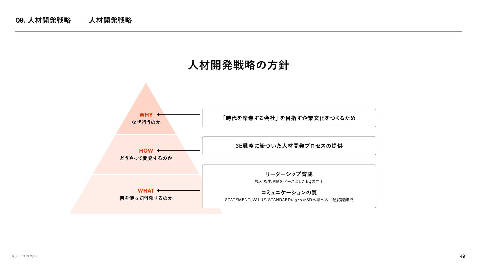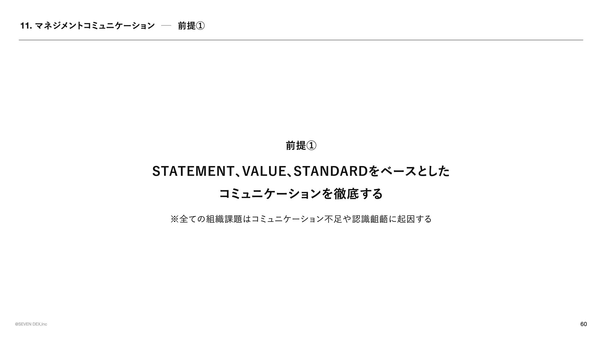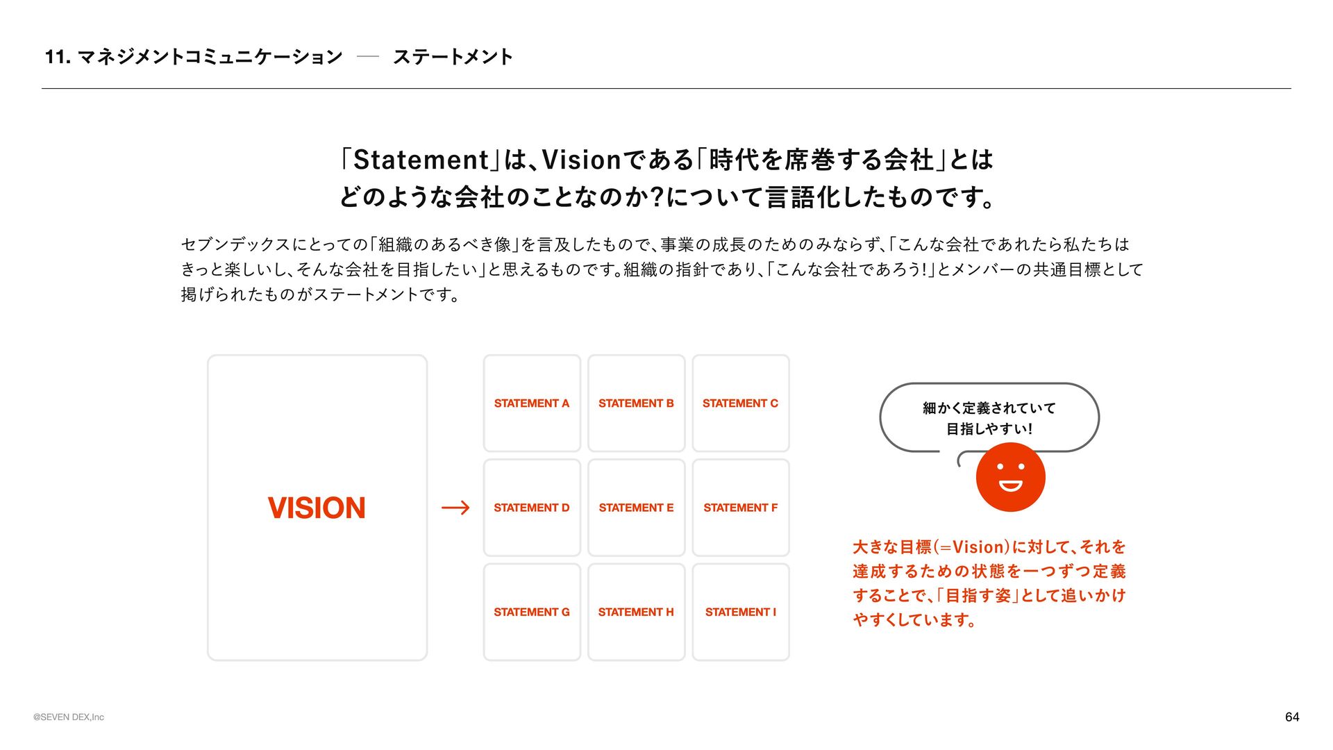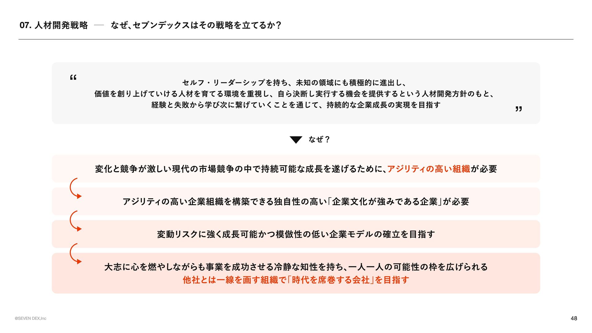 TEMENT セブンデックスが 「どんな姿勢で、 どんな選択をする会社であり続けるか」 を示した行動の約束 マーケティングの力で革命を起こす 提供する価値が顧客体験として届き、 その体験が共感や支持を生み、 次の成長へと繋がっていく流れをつくる 社会が前進する可能性のある領域に参入する 表面だけを変えるビジネスではなく、 ユーザーや社会にとって実感できる価値が増える領域で挑戦する No.1を目指す 良いだけでは満足せず、 選ばれ、 ココロが動く存在でありたいからこそ、 常に一番上の水準に挑戦し続ける メイクドラ マをあ らゆ る と こ ろ で 日 常の 中 に感 情 を 重ね 、 出来事 を 経 験や感動へと変えていくことで、 一つ ひ とつを 特別 な も のにしていこ う 今 のあ たりまえ を 打ち壊し 、 次 のあ たりまえ の 先駆者 に なれ 慣習 や 前例 をその まま踏襲 せず、 本当 に価値があるかを 考 え 直 し、 よ り良い 形 を 自 ら 試 し、 広げ ていく 可能性に ベットし凡事徹底 で 貫く 将来性 を感 じ た挑戦に 本気 で 向 き 合 い、 日々 の 基本 や 約束 を 徹底的積 み 重ね 続けることで 結果 につな げ る そろばん を 持ってロ マンを 語 る 組織 に 現 実 的判断 や 計算 は 重ね ながら も 、 どん な 未来 をつくりたいのかとい う ロ マンも大切 に 語 る 形骸化や惰 性を 嫌い 、 組織 の サビ を 防ぐ 決ま ったやり 方 を続けることに 安心 せず、 今も意味 があるかを 問 い 直 し、 必要 なら変え続けていこ う 挑戦した敗者 に はセカ ン ドチャ ン ス を 与え る 最後ま で 向 き 合 った挑戦から 学び を 正 しく 受 け 止め 、 その 経 験を次に 活 かす 姿勢 を持つ 人 には 再び 挑戦の 機 会を ひ らく 意欲 ある 人 に は年齢やキャリア に 関係なく抜擢 を 肩書 きや 年 次ではなく、 挑戦したい 意志 とその 責任 を 引 き 受 ける 覚悟も重視 し、 機 会と 役割 を 積極的 に 託 す チ ー ムセブ ン デックス の 意識 を 常 に 持つ 自分 の 言 動が 個人 の も のにと どま らず、 仲間 や 組織全 体の 評 価につながることを 意識 しながら 行 動する モラル のある会社に ル ー ル に 縛 られるだけでなく 自由 な挑戦の 中 で も何 を 大切 にす べ きかを 考 える 。 採用は全 力を 尽く す 今 を 埋め るた め ではなく、 これからの セブンデック スを共につくる 仲間 を 迎 えるた め に、 時間も労力も惜 し ま ず 向 き 合う