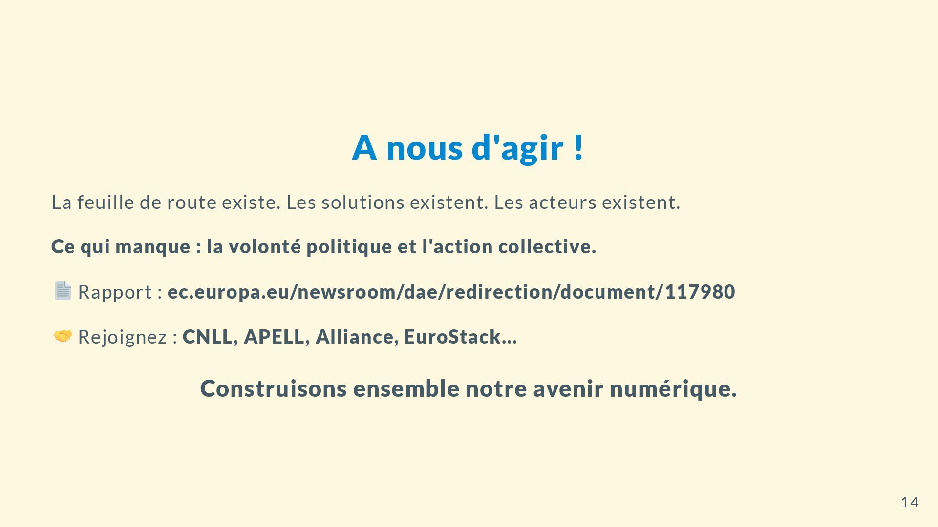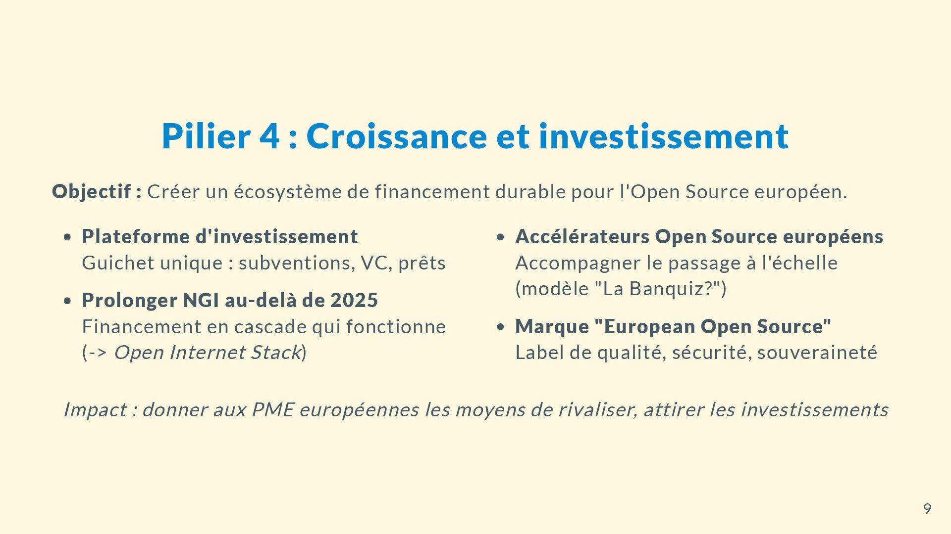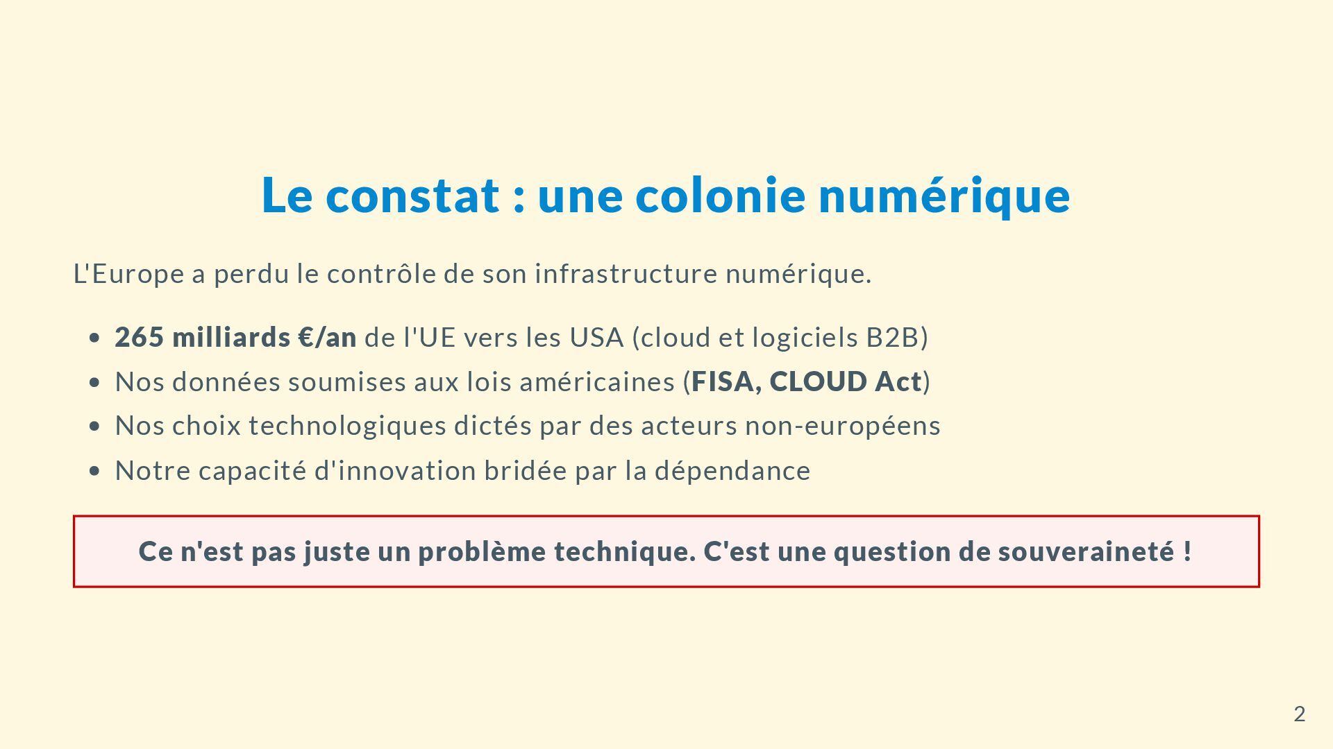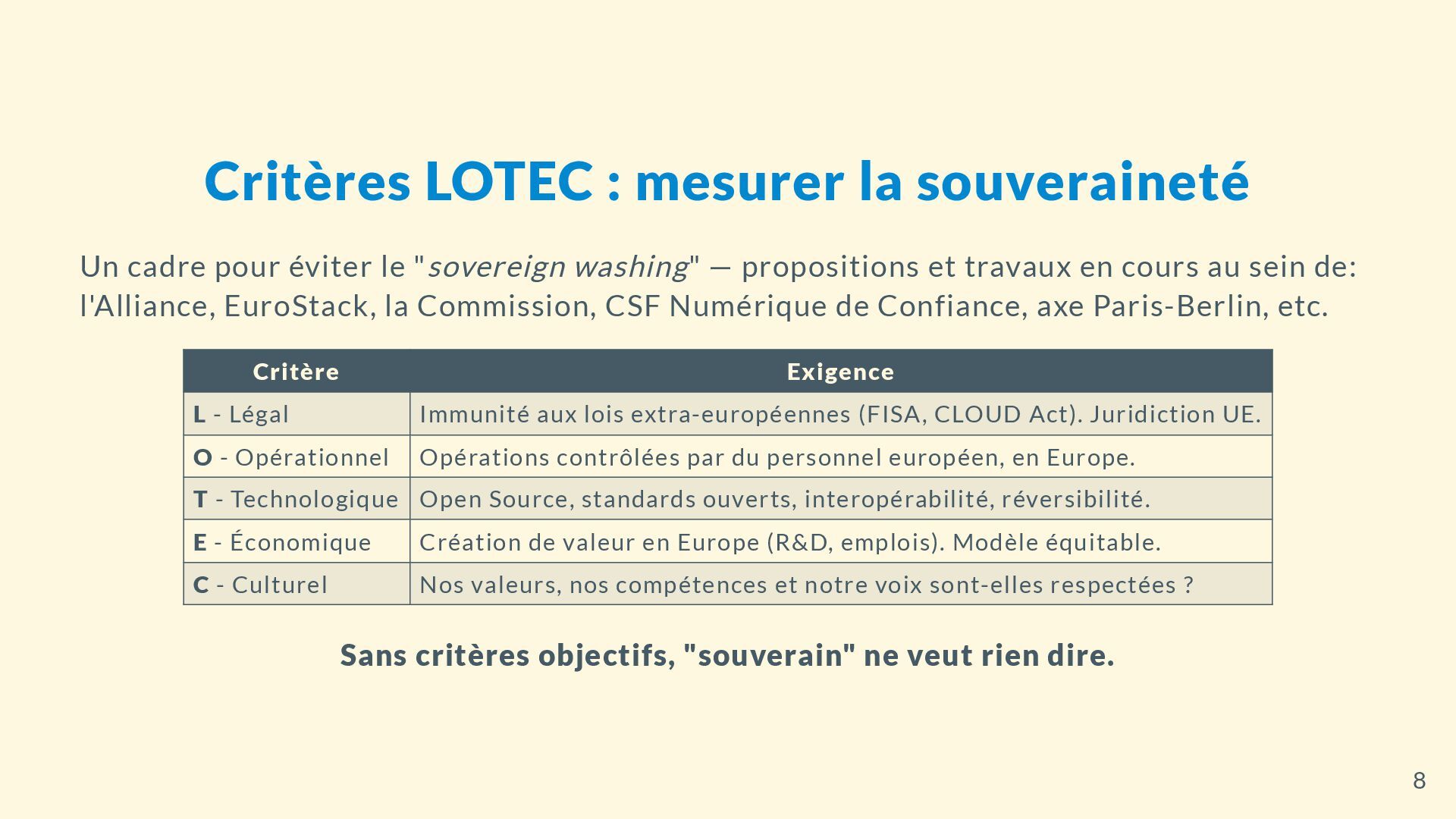 le "sovereign washing" — propositions et travaux en cours au sein de: l'Alliance, EuroStack, la Commission, CSF Numérique de Confiance, axe Paris-Berlin, etc. Critère Exigence L - Légal Immunité aux lois extra-européennes (FISA, CLOUD Act). Juridiction UE. O - Opérationnel Opérations contrôlées par du personnel européen, en Europe. T - Technologique Open Source, standards ouverts, interopérabilité, réversibilité. E - Économique Création de valeur en Europe (R&D, emplois). Modèle équitable. C - Culturel Nos valeurs, nos compétences et notre voix sont-elles respectées ? Sans critères objectifs, "souverain" ne veut rien dire. 8