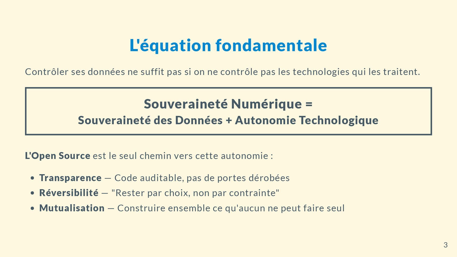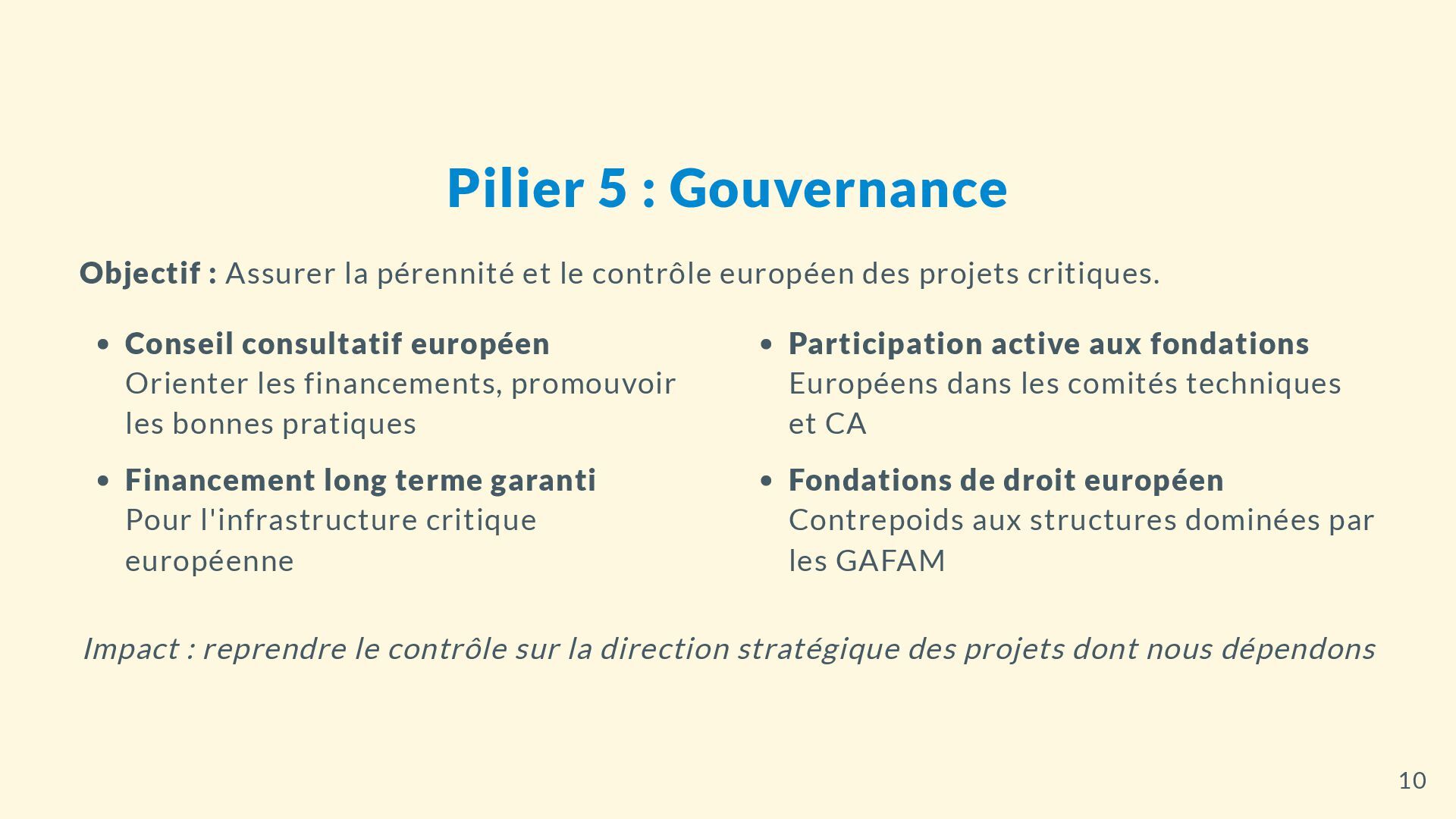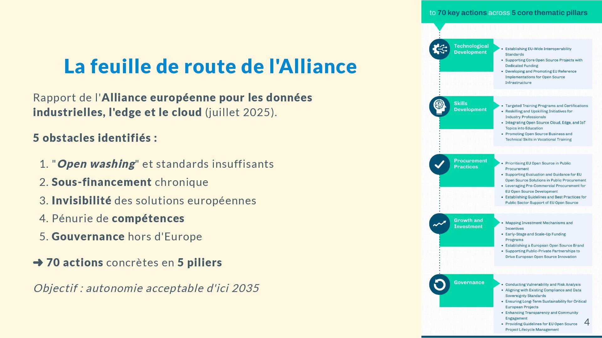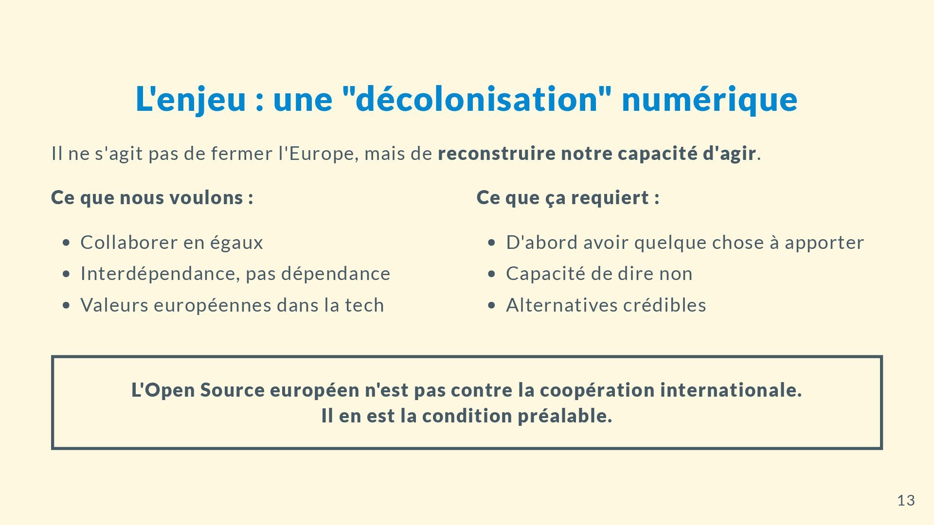 le "sovereign washing" — propositions et travaux en cours au sein de: l'Alliance, EuroStack, la Commission, CSF Numérique de Confiance, axe Paris-Berlin, etc. Critère Exigence L - Légal Immunité aux lois extra-européennes (FISA, CLOUD Act). Juridiction UE. O - Opérationnel Opérations contrôlées par du personnel européen, en Europe. T - Technologique Open Source, standards ouverts, interopérabilité, réversibilité. E - Économique Création de valeur en Europe (R&D, emplois). Modèle équitable. C - Culturel Nos valeurs, nos compétences et notre voix sont-elles respectées ? Sans critères objectifs, "souverain" ne veut rien dire. 8