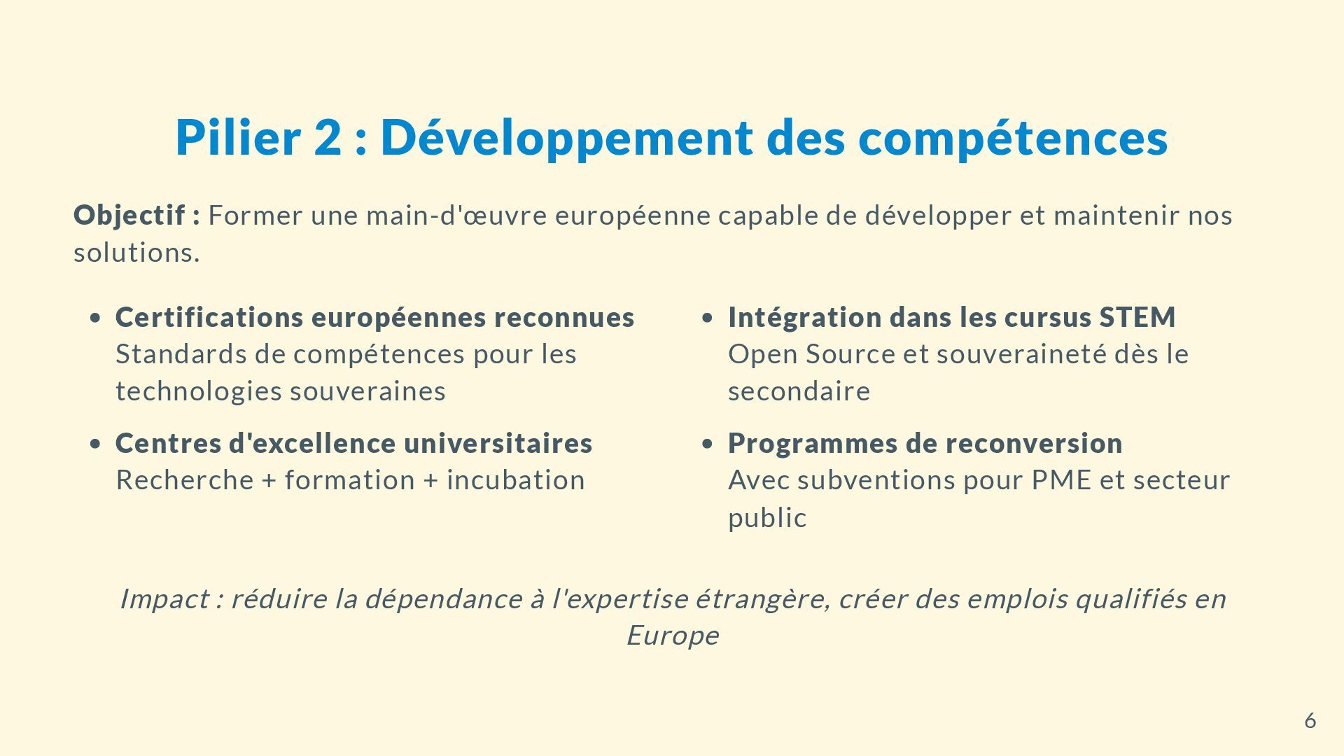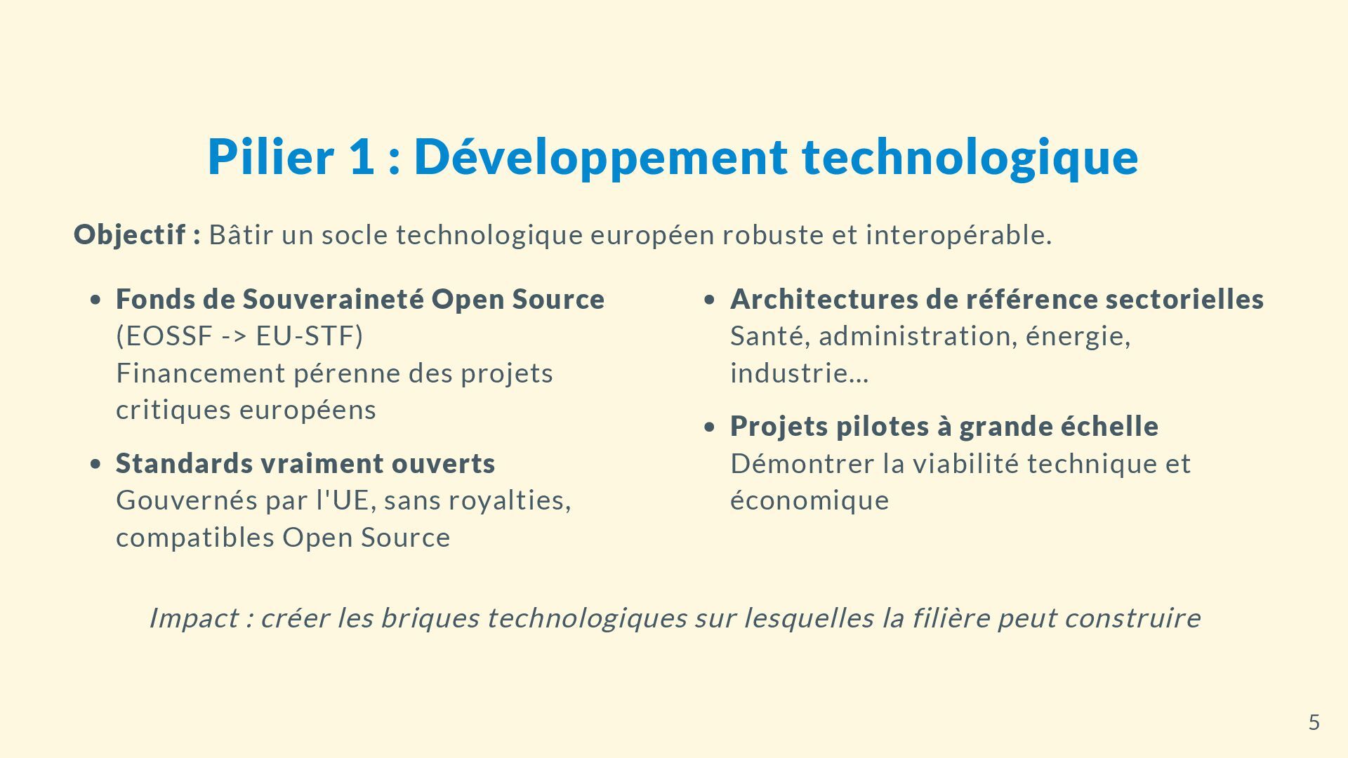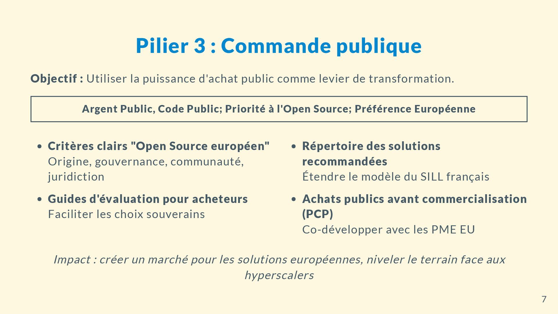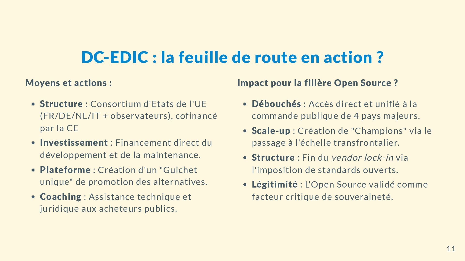 le "sovereign washing" — propositions et travaux en cours au sein de: l'Alliance, EuroStack, la Commission, CSF Numérique de Confiance, axe Paris-Berlin, etc. Critère Exigence L - Légal Immunité aux lois extra-européennes (FISA, CLOUD Act). Juridiction UE. O - Opérationnel Opérations contrôlées par du personnel européen, en Europe. T - Technologique Open Source, standards ouverts, interopérabilité, réversibilité. E - Économique Création de valeur en Europe (R&D, emplois). Modèle équitable. C - Culturel Nos valeurs, nos compétences et notre voix sont-elles respectées ? Sans critères objectifs, "souverain" ne veut rien dire. 8