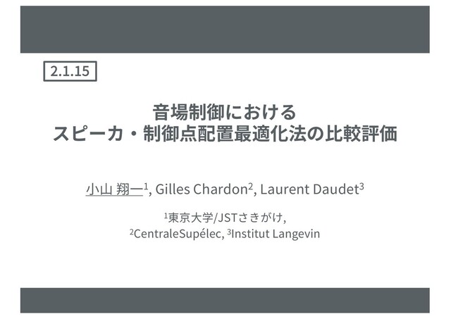 各スピーカの伝達関数を補間関数,制御点をサンプリング点とみ なすことにより⾳場制御の問題に適⽤ – 伝達関数⾏列の 誤差ノルムを規準とする貪欲法 Ø 様々な⼆次⾳源∕センサ配置最適化法を⾳場制御の問題に 適⽤し,数値実験による⽐較評価を⾏う – Koyama, Chardon, and Daudet, “Optimizing Source and Sensor Placement for Sound Field Control: An Overview,” IEEE/ACM Trans. Audio, Speech, Lang. Process., vol. 28, 2020. – 再現実験のためのMATLABスクリプトを公開 https://github.com/sh01k/SourceSensorPlacementSFC Sep 10, 2020 8 [Koyama+, ICASSP, 2018]