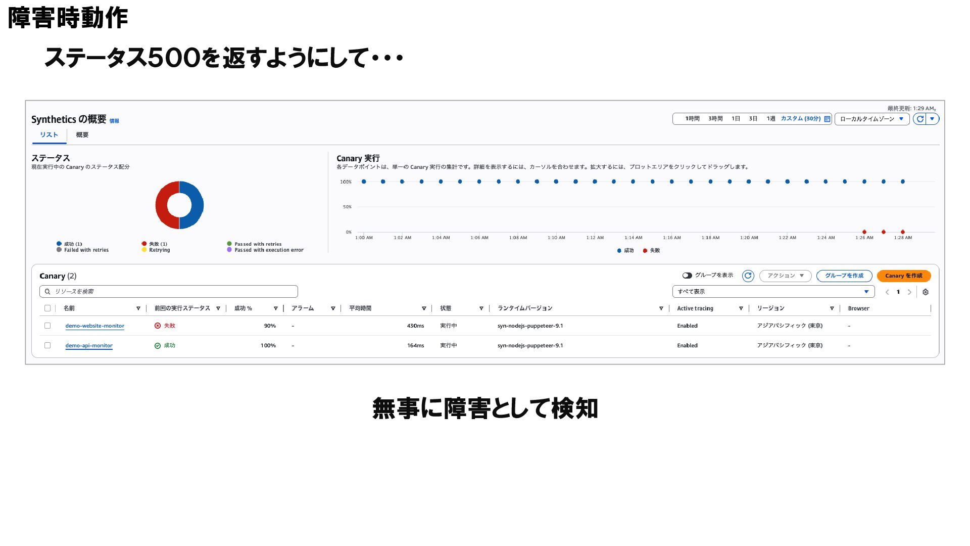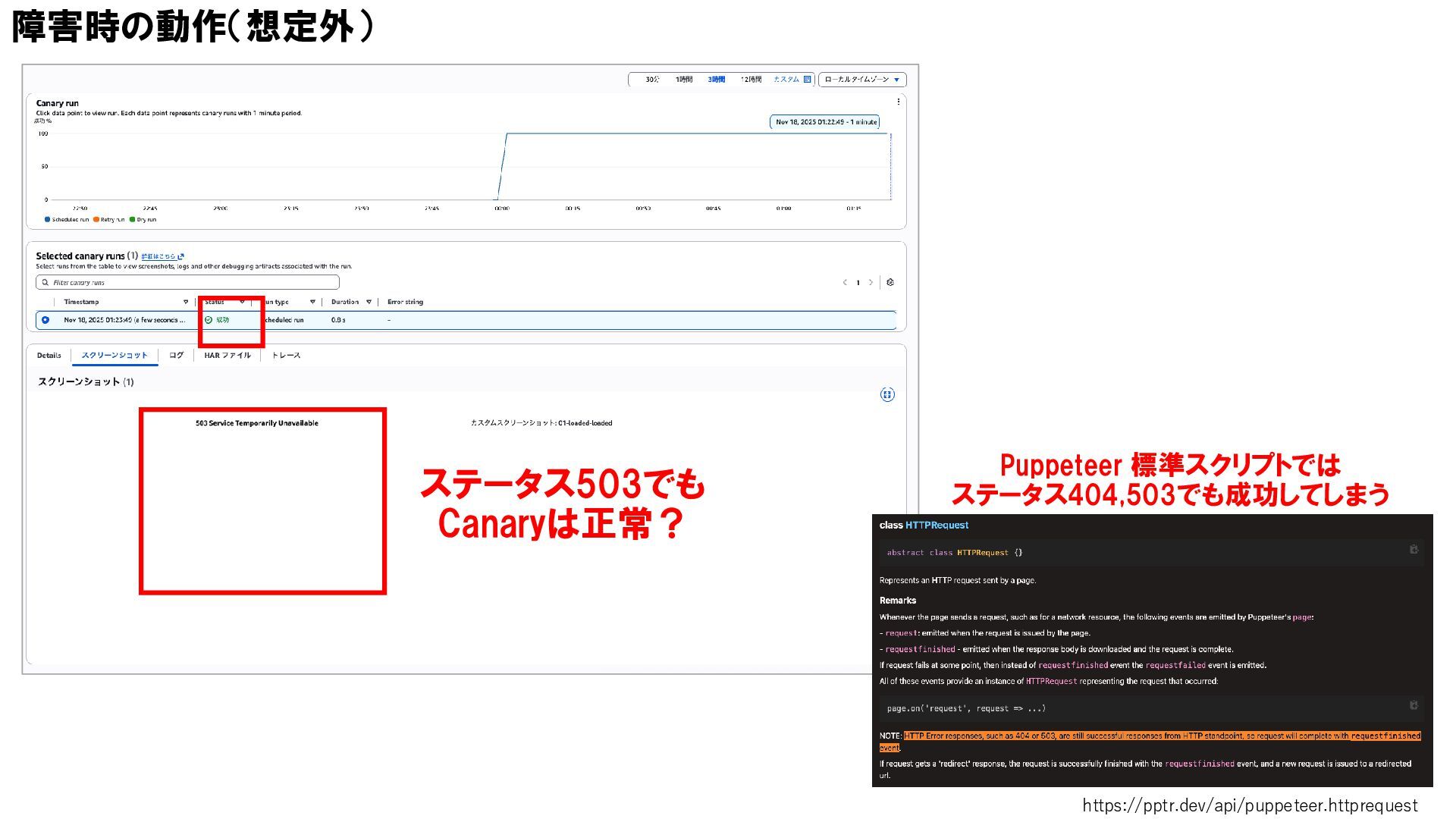 ステータス503でも Canaryは正常? 障害時の動作(想定外) Puppeteer 標準スクリプトでは ステータス404,503でも成功してしまう https://pptr.dev/api/puppeteer.httprequest