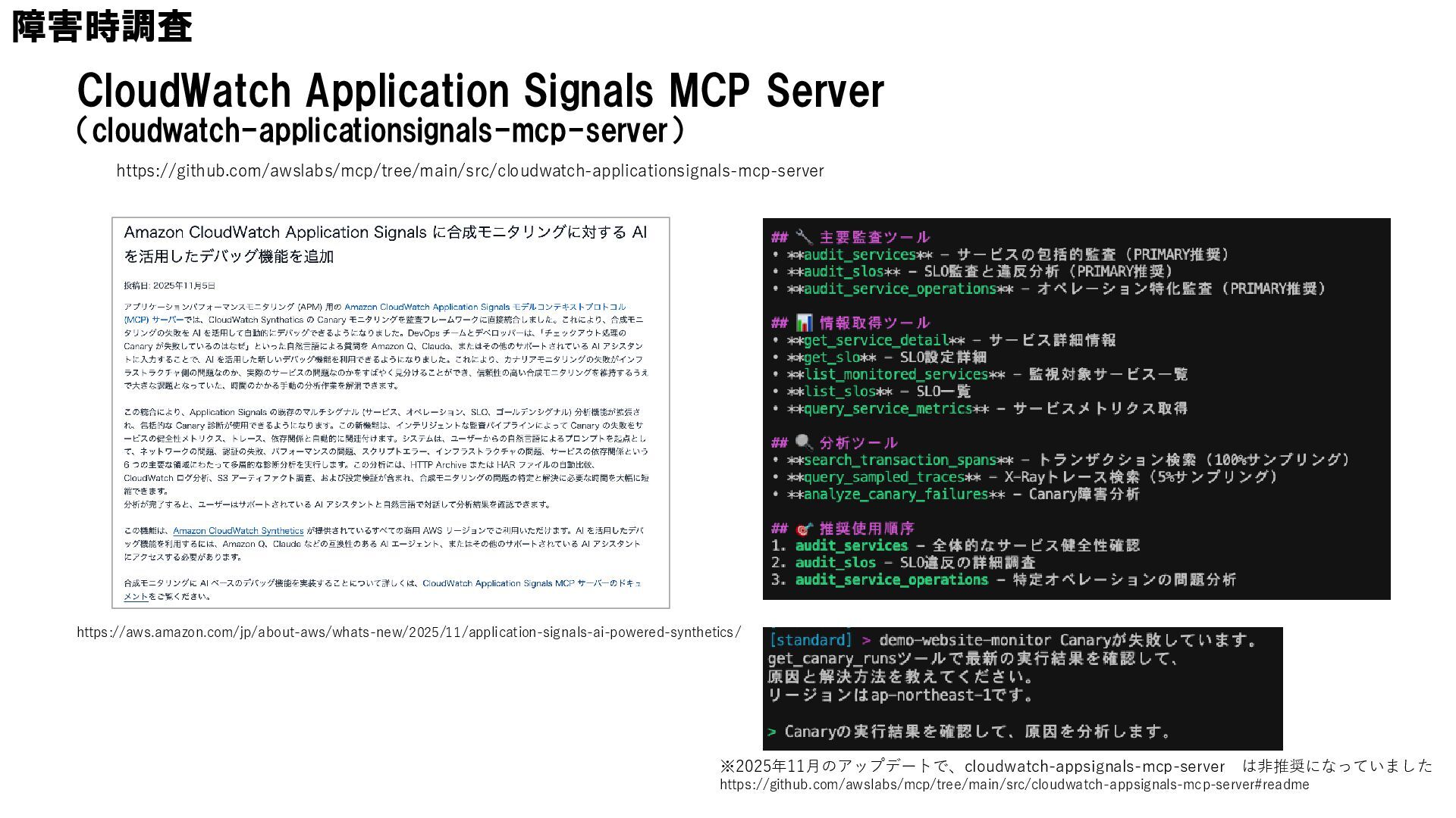 障害時調査 CloudWatch Application Signals MCP Server (cloudwatch-applicationsignals-mcp-server) https://github.com/awslabs/mcp/tree/main/src/cloudwatch-applicationsignals-mcp-server ※2025年11月のアップデートで、cloudwatch-appsignals-mcp-server は非推奨になっていました