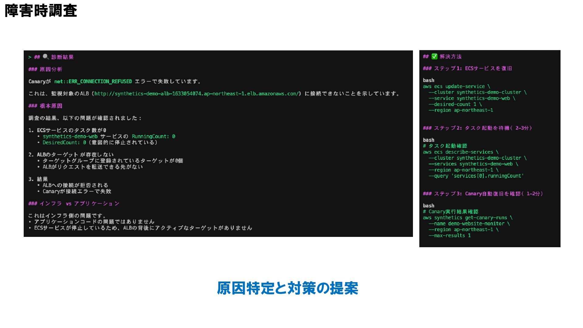 まとめ CloudWatch Synthetics 実際の利用者視点で運用監視 SLO/SLIのベースにも拡張可能 AI活用した調査で運用担当者の負担も軽減