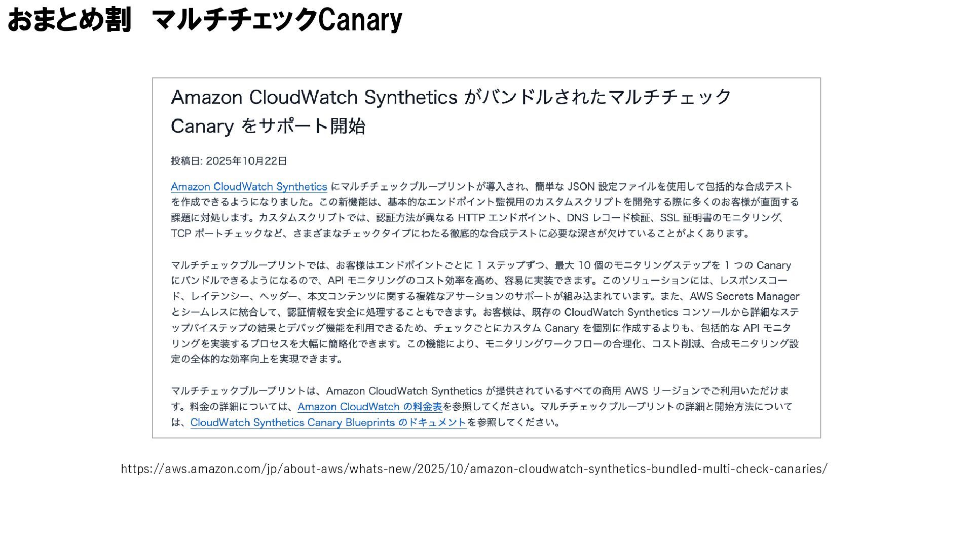 おまとめ割 マルチチェックCanary https://aws.amazon.com/jp/about-aws/whats-new/2025/10/amazon-cloudwatch-synthetics-bundled-multi-check-canaries/