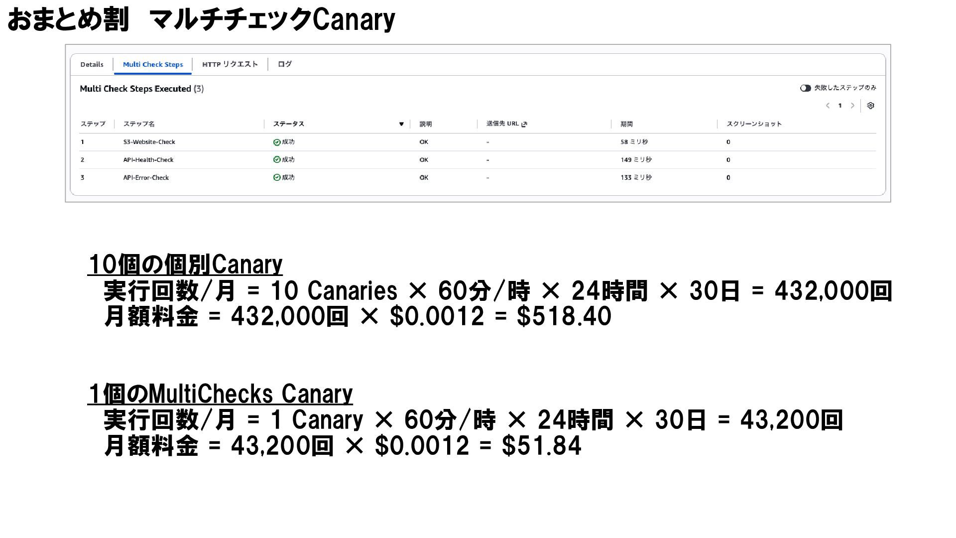 30日 = 432,000回 月額料金 = 432,000回 × $0.0012 = $518.40 1個のMultiChecks Canary 実行回数/月 = 1 Canary × 60分/時 × 24時間 × 30日 = 43,200回 月額料金 = 43,200回 × $0.0012 = $51.84 おまとめ割 マルチチェックCanary