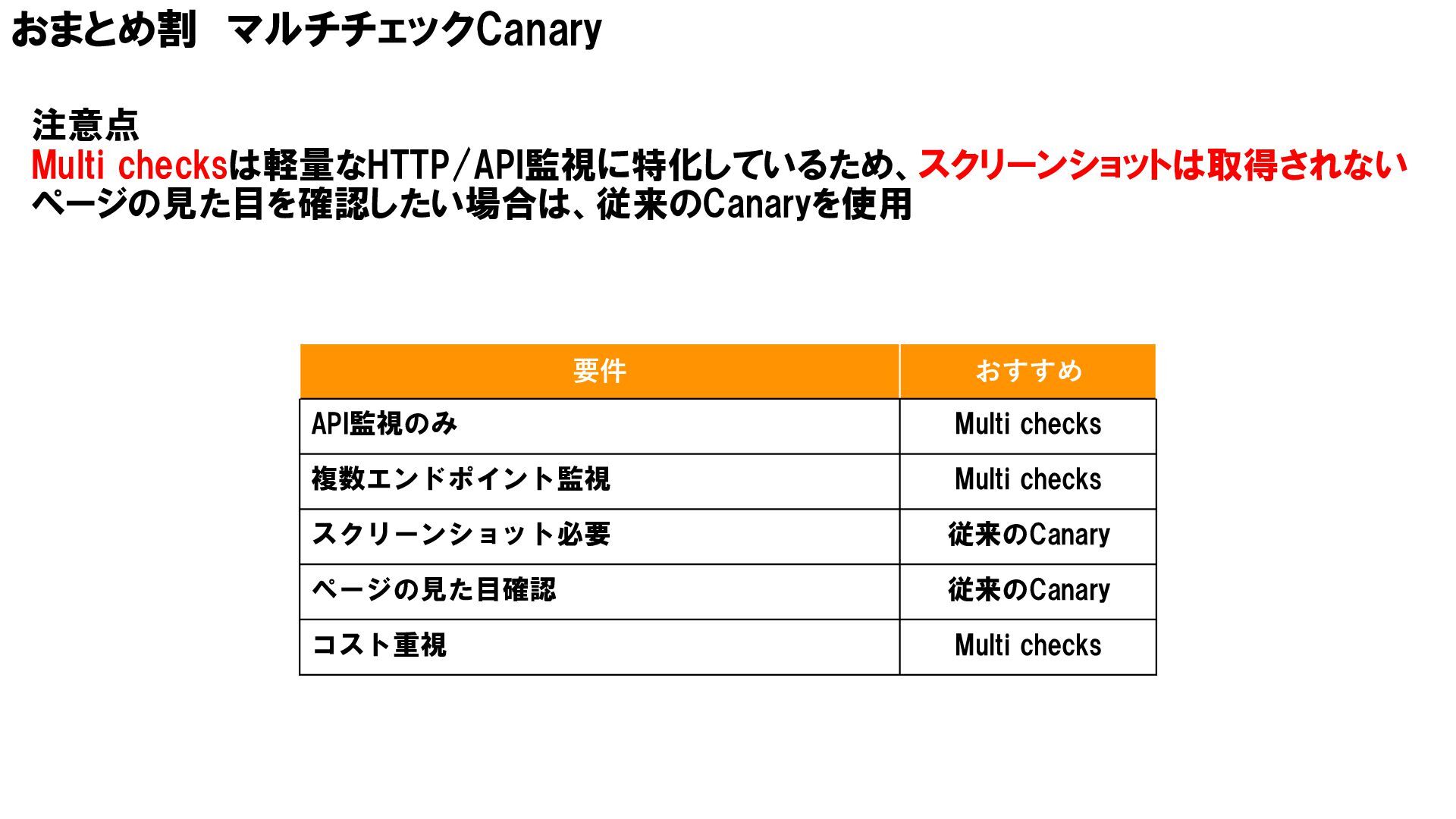 Multi checks スクリーンショット必要 従来のCanary ページの見た目確認 従来のCanary コスト重視 Multi checks おまとめ割 マルチチェックCanary