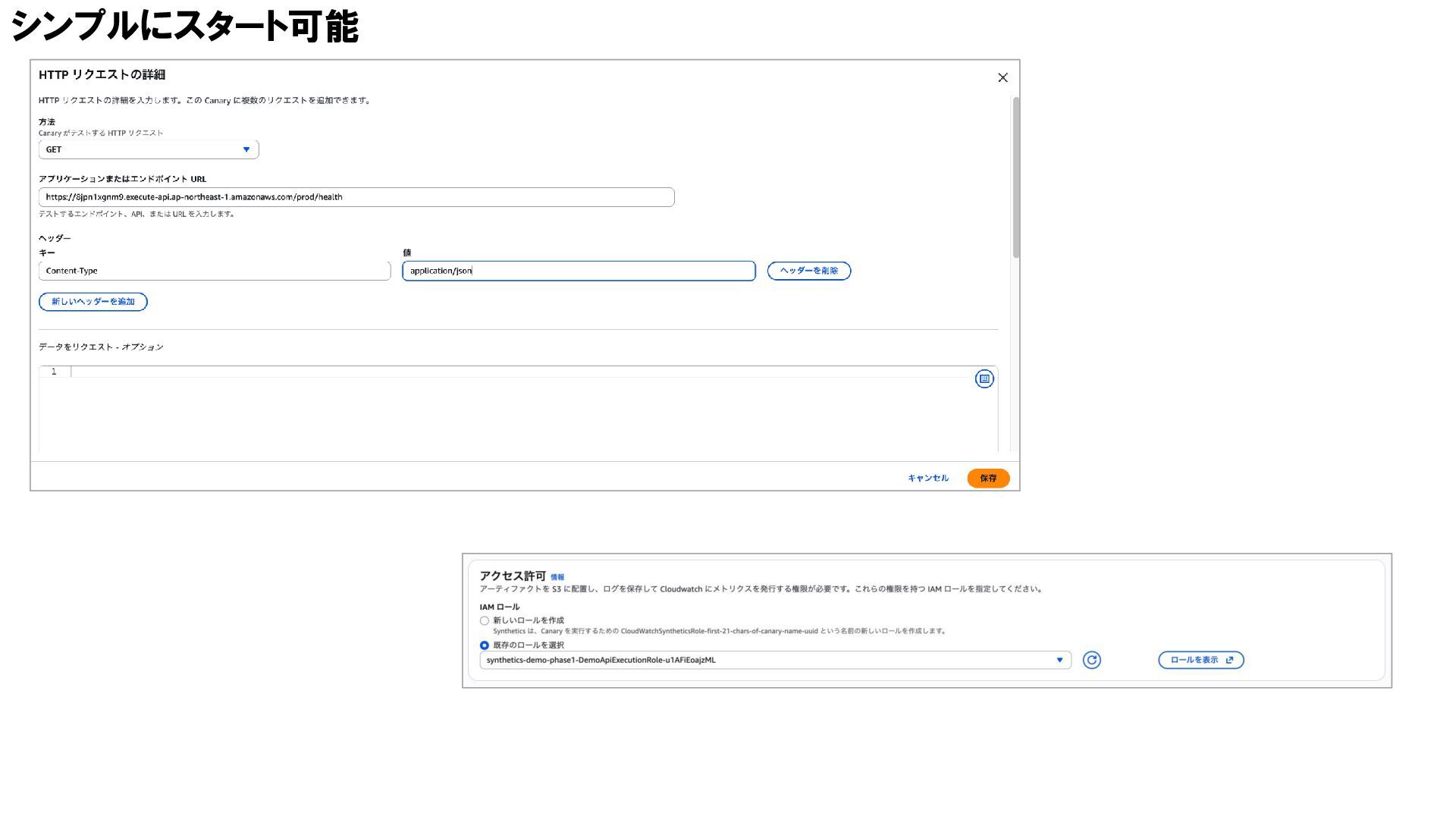 実行ログ スクショ HTTPアーカイブ Webサイト APIエンドポイント メトリクス、トレース AWS X-Ray CloudWatch Synthetics Canaries Canary WebサイトやAPIの稼働状況について、実際の操作やリクエストを模して監視ができる 閾値に基づいてエラーがあればアラート通報も可能 ・HTTP ステータスコード確認 ・レスポンスタイム計測 ・ビジュアルモニタリング(画面差分) ・DNS 解決確認 ・API、シナリオ動作確認