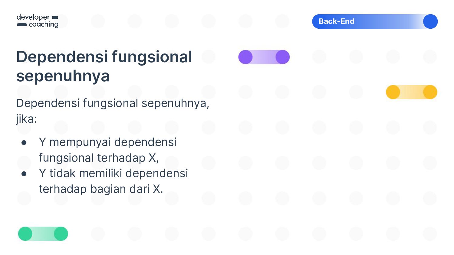 Dependensi fungsional sepenuhnya Back-End Dependensi fungsional sepenuhnya, jika: • Y