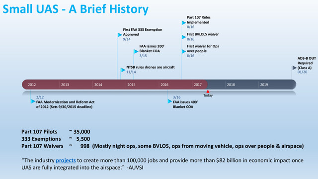 2015 2016 2017 2018 2019 First FAA 333 Exemption Approved 9/14 NTSB rules drones are aircraft 11/14 FAA issues 200' Blanket COA 3/15 Part 107 Rules Implemented 8/16 First waiver for Ops over people 8/16 First BVLOLS waiver 8/16 ADS-B OUT Required (Class A) 01/20 FAA Modernization and Reform Act of 2012 (Sets 9/30/2015 deadline) 2/12 FAA issues 400' Blanket COA 3/16 Part 107 Pilots ~ 35,000 333 Exemptions ~ 5,500 Part 107 Waivers ~ 998 (Mostly night ops, some BVLOS, ops from moving vehicle, ops over people & airspace) “The industry projects to create more than 100,000 jobs and provide more than $82 billion in economic impact once UAS are fully integrated into the airspace.” -AUVSI