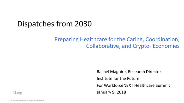 SR-XXXX Dispatches from 2030 Preparing Healthcare for the Caring, Coordination, Collaborative, and Crypto- Economies 1 Rachel Maguire, Research Director Institute for the Future For WorkforceNEXT Healthcare Summit January 9, 2018