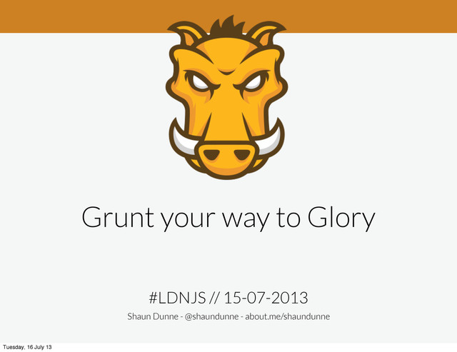 ); jshint: { options: { jshintrc : '.jshintrc' }, all: ['assets/**/*.js'] } grunt.loadNpmTasks('grunt-contrib-jshint'); , ['jshint'] Name of task Tasks to run Tuesday, 16 July 13