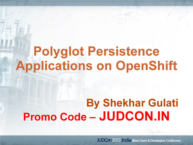 can build polyglot persistence applications on it. • MongoDB makes it very easy to build location aware applications. • All the Spring latest projects work without any problem on OpenShift. • Did I mention – Free? • What are you waiting for? Try it out. • Sign up using JUDCON.IN promo code.