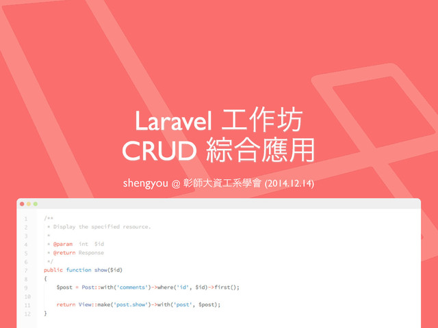 ࿏ኸٴ Controller తവ໊ࣜ᜝ ಈࢺ ࿏ኸ ಈ࡞ ໊᜝ GET /resource index resource.index GET /resource/create create resource.create POST /resource store resource.store GET /resource/{id} show resource.show GET /resource/{id}/edit edit resource.edit PUT/PATCH /resource/{id} update resource.update DELETE /resource/{id} destroy resource.destroy ˒ ჩߟɿhttp://laravel.tw/docs/4.2/controllers#restful-resource-controllers