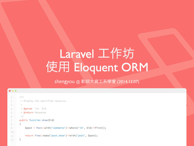 $post  =  Post::find(1); echo  $post-­‐>category-­‐>name; foreach($post-­‐>comments  as  $comment) {        echo  $comment-­‐>content; }
