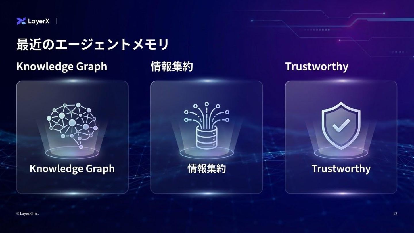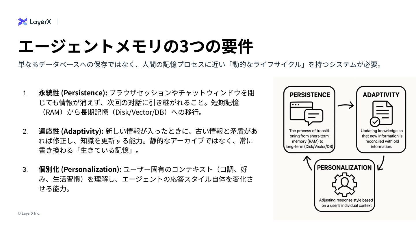 4. © LayerX Inc. 6 エージェントメモリの3つの要件 単なるデータベースへの保存ではなく、⼈間の記憶プロセスに近い「動的なライフサイクル」を持つシステムが必要。 1. 永続性 (Persistence): ブラウザセッションやチャットウィンドウを閉