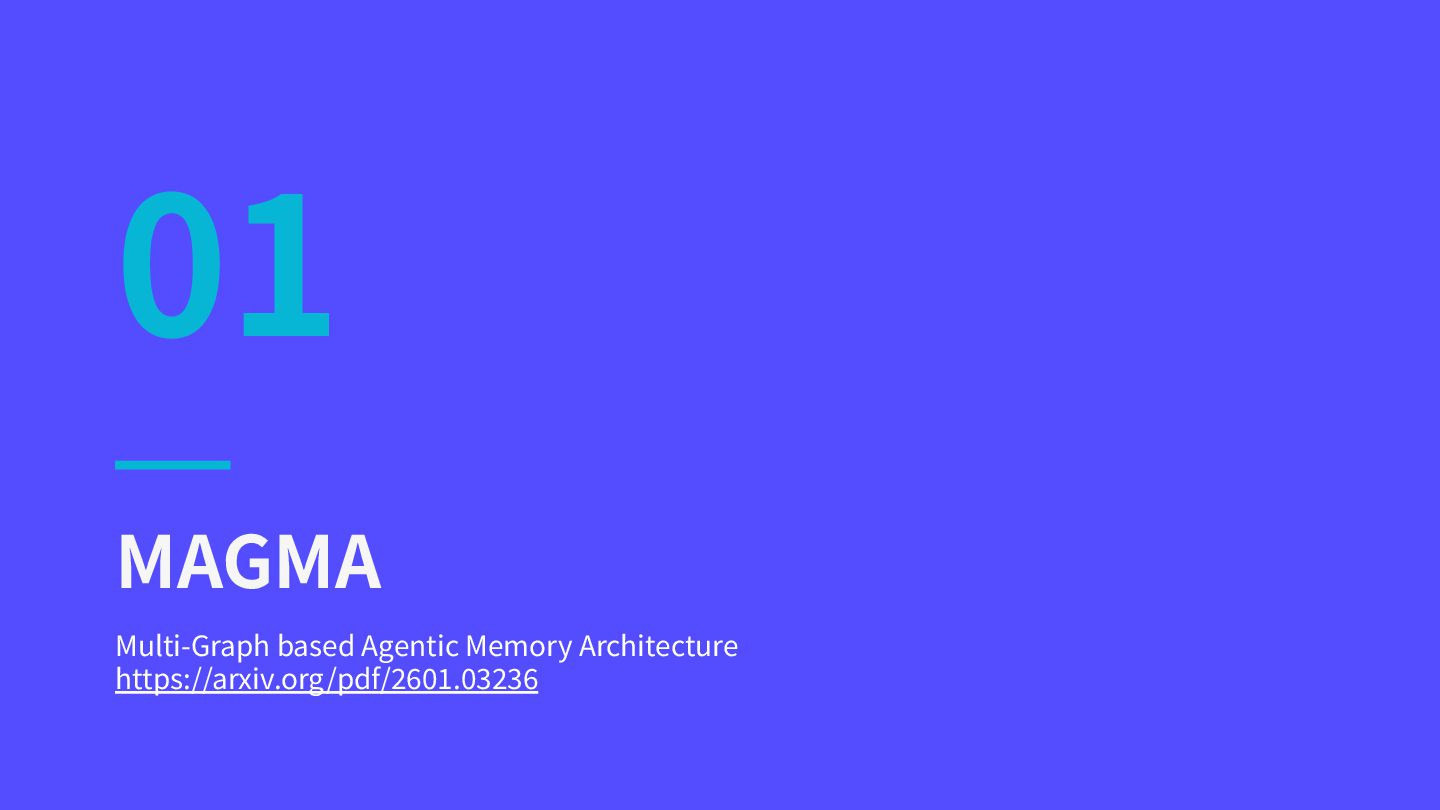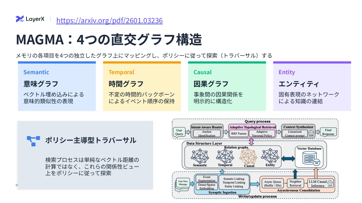 不変の時間的バックボーン によるイベント順序の保持 Causal 因果グラフ 事象間の因果関係を 明⽰的に構造化 Entity エンティティ 固有表現のネットワーク による知識の連結 ポリシー主導型トラバーサル 検索プロセスは単純なベクトル距離の 計算ではなく、これらの関係性ビュー 上をポリシーに従って探索 メモリの各項⽬を4つの独⽴したグラフ上にマッピングし、ポリシーに従って探索(トラバーサル)する MAGMA:4つの直交グラフ構造 https://arxiv.org/pdf/2601.03236