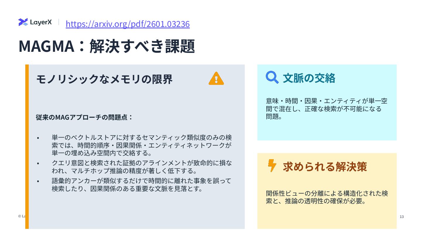 9. © LayerX Inc. 13 モノリシックなメモリの限界 従来のMAGアプローチの問題点: • 単⼀のベクトルストアに対するセマンティック類似度のみの検 索では、時間的順序‧因果関係‧エンティティネットワークが 単⼀の埋め込み空間内で交絡する。