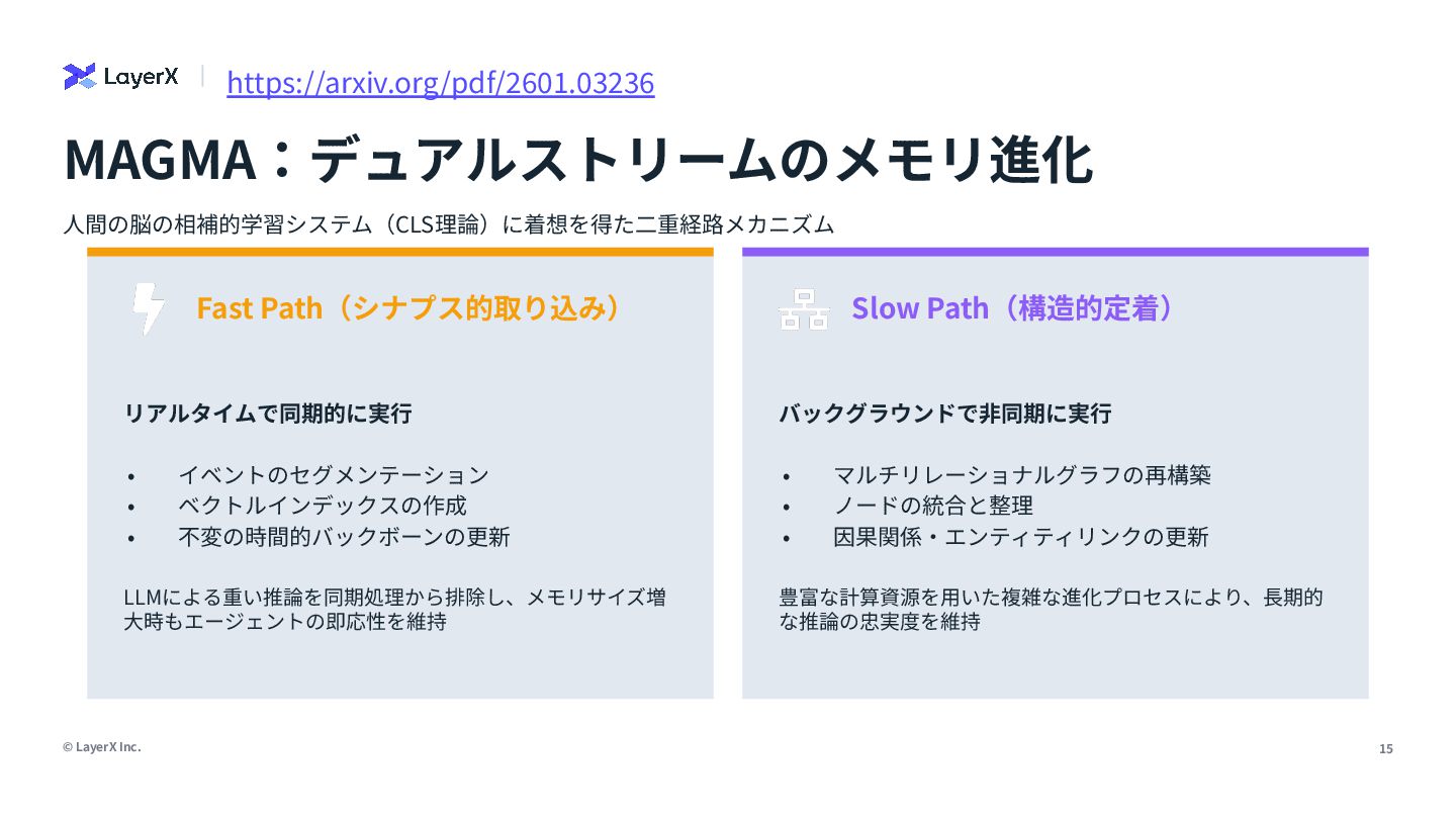 ベクトルインデックスの作成 • 不変の時間的バックボーンの更新 LLMによる重い推論を同期処理から排除し、メモリサイズ増 ⼤時もエージェントの即応性を維持 Slow Path(構造的定着) バックグラウンドで⾮同期に実⾏ • マルチリレーショナルグラフの再構築 • ノードの統合と整理 • 因果関係‧エンティティリンクの更新 豊富な計算資源を⽤いた複雑な進化プロセスにより、⻑期的 な推論の忠実度を維持 ⼈間の脳の相補的学習システム(CLS理論)に着想を得た⼆重経路メカニズム MAGMA:デュアルストリームのメモリ進化 https://arxiv.org/pdf/2601.03236