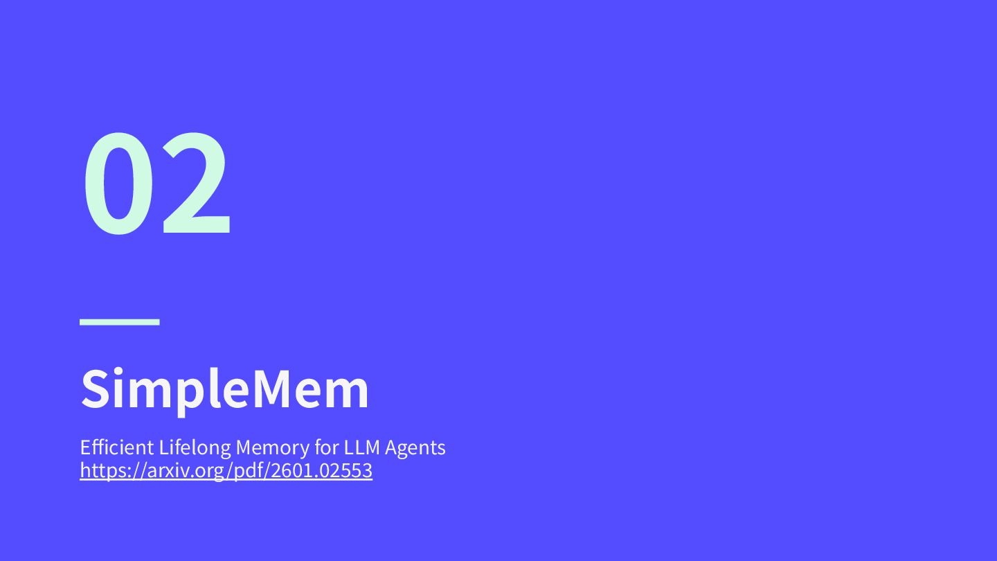• 冗⻑な反復情報 これらをすべて保持すると、メモリバッファの情報密度 が極端に低下し、検索精度が悪化するだけでなく、推論 時‧検索時のトークン消費量が指数関数的に増⼤する。 既存⼿法の限界 Mem0、ReadAgent等は反復的推論でノイズをフィ ルタリングするが、推論サイクルの繰り返しによ り、レイテンシ増⼤とトークン使⽤量増加を招く。 SimpleMemの⽬標 意味的ロスレス圧縮を中⼼に構築し、限られたトー クン予算とコンテキスト制約の下で情報効率を最⼤ 化するメモリフレームワーク。 https://arxiv.org/pdf/2601.02553 SimpleMem:解決すべき課題