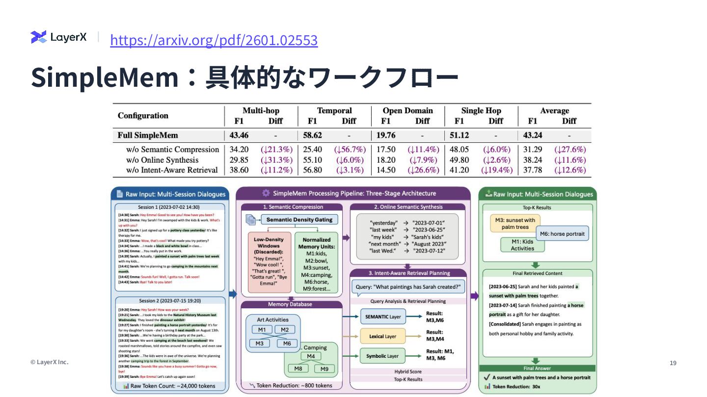 13. © LayerX Inc. 18 SimpleMem:3段階のメモリ圧縮、整理、推論 第2段階:OSS Online Semantic Synthesis 再帰的統合とマルチビューインデックス