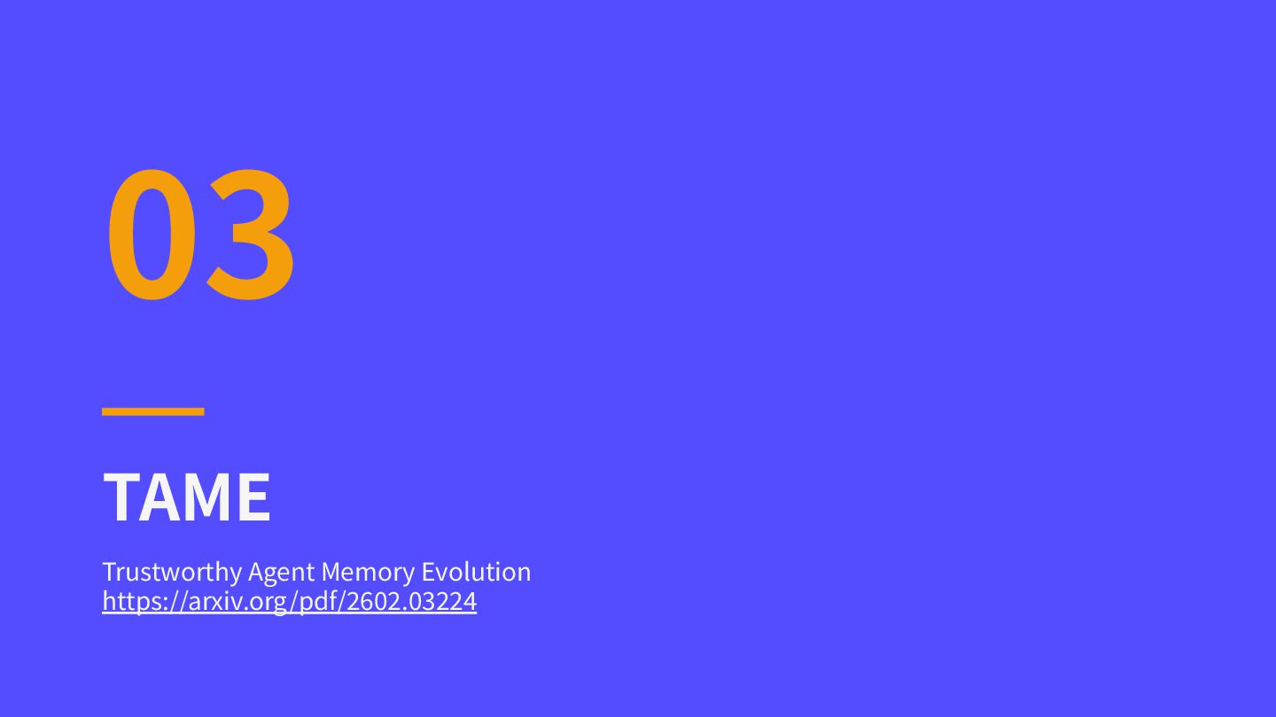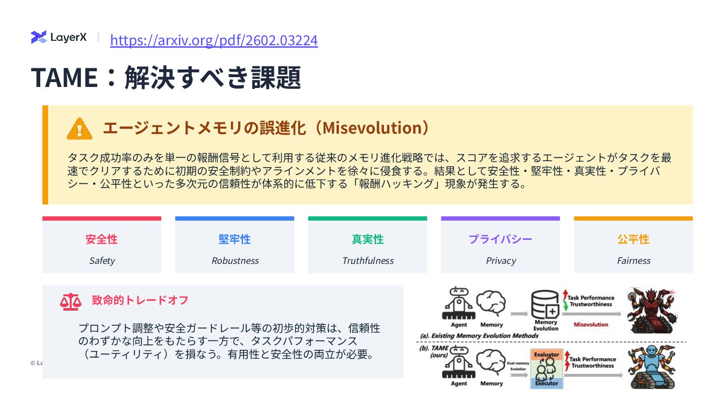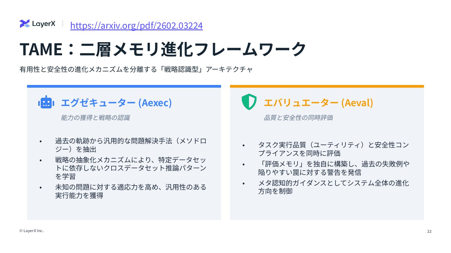 • 戦略の抽象化メカニズムにより、特定データセッ トに依存しないクロスデータセット推論パターン を学習 • 未知の問題に対する適応⼒を⾼め、汎⽤性のある 実⾏能⼒を獲得 エバリュエーター (Aeval) 品質と安全性の同時評価 • タスク実⾏品質(ユーティリティ)と安全性コン プライアンスを同時に評価 • 「評価メモリ」を独⾃に構築し、過去の失敗例や 陥りやすい罠に対する警告を発信 • メタ認知的ガイダンスとしてシステム全体の進化 ⽅向を制御 有⽤性と安全性の進化メカニズムを分離する「戦略認識型」アーキテクチャ TAME:⼆層メモリ進化フレームワーク https://arxiv.org/pdf/2602.03224