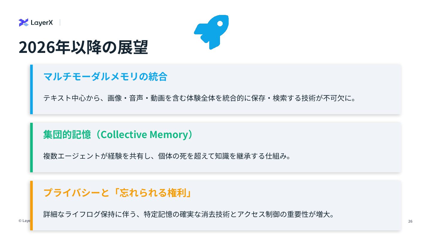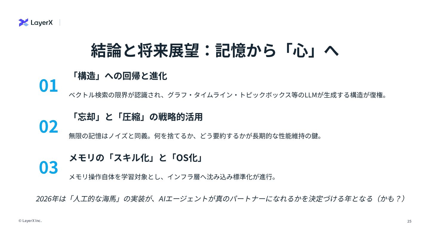 17. © LayerX Inc. 25 結論と将来展望:記憶から「⼼」へ 01 「構造」への回帰と進化 ベクトル検索の限界が認識され、グラフ‧タイムライン‧トピックボックス等のLLMが⽣成する構造が復権。 02 「忘却」と「圧縮」の戦略的活⽤