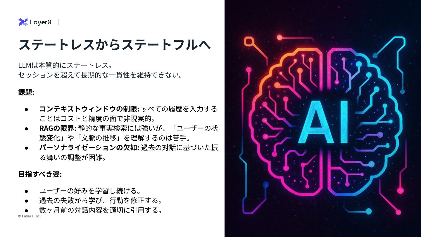 3. © LayerX Inc. 5 ステートレスからステートフルへ LLMは本質的にステートレス。 セッションを超えて⻑期的な⼀貫性を維持できない。 課題: • コンテキストウィンドウの制限: